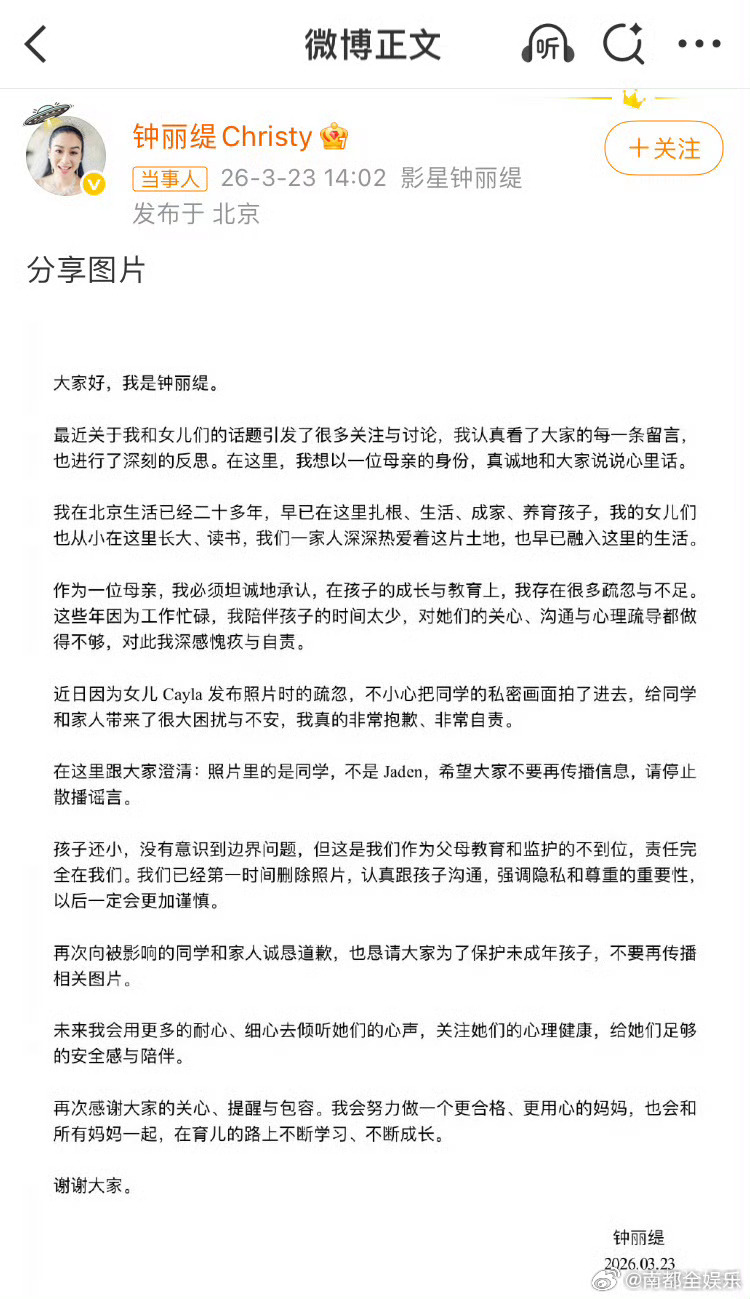 钟丽缇发文回应女儿争议钟丽缇就女儿考拉争议道歉今日,钟丽缇发文回应女儿考拉近期的争议,她澄清考拉晒出的有争议的照片中被不慎泄露隐私的是她的同学,不是姐姐Jaden,并道歉:“我认真看了大家的每一条留言,也进行了深刻的反思。我在北京生活已经二十多年,早已在这里扎根、生活、成家、养育孩子,我的女儿们也从小在这里长大、读书,我们一家人深深热爱着这片土地,也早已融入这里的生活。作为一位母亲,我必须坦诚地承认,在孩子的成长与教育上,我存在很多疏忽与不足。孩子还小,没有意识到边界问题。但这是我们作为父母教育和监护的不到位,责任完全在我们。我们已经第一时间删除照片,认真跟孩子沟通,强调隐私和尊重的重要性,以后一定会更加谨慎。再次向被影响的同学和家人诚恳道歉,也恳请大家为了保护未成年孩子,不要再传播相关图片。”钟丽缇 责任完全在我们