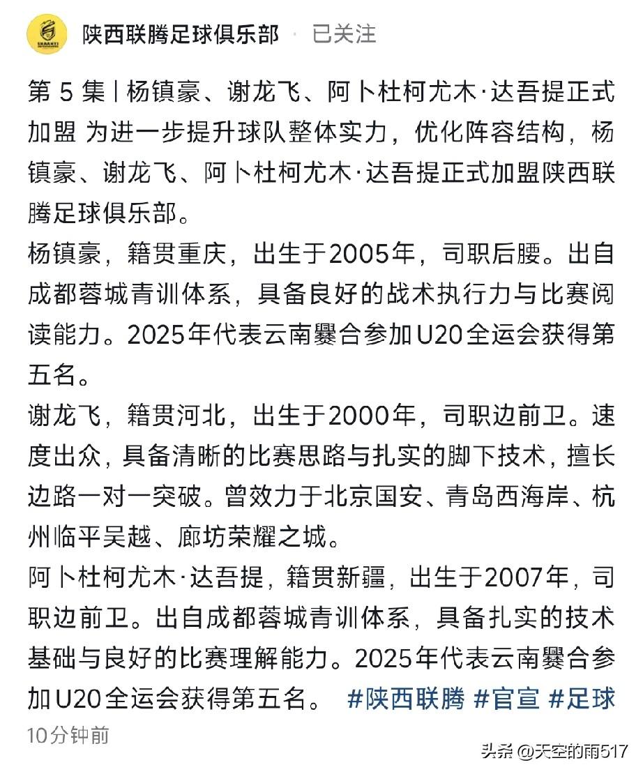 刚刚,陕西联腾俱乐部官方公告又引进了三名球员。陕西联腾今年高调亮相,吸引了不少陕西球迷的目光。 就在昨天下午,在陕西省足球训练基地,也就是陕西球迷熟知的丈八训练基地,这里曾是国力、浐灞、长安竞技的训练基地。昨天,一部分陕西球迷圈里的知名球迷来到丈八训练基地,观看联腾队的训练,并与球员互动。他们对这支以陕西本土青年球员为主、获得过全运会第六名的新球队表示肯定,期望其能冲乙成功,为振兴陕西足球拼搏奋进。有陕西球迷作为你们坚实的后盾,你们一定会重振陕西足球,重回最高联赛。 与联腾球员互动后,球迷们又前往省训练中心的另一块场地,慰问在此训练的陕西青年女足,为年轻的陕西U18女足加油鼓劲。