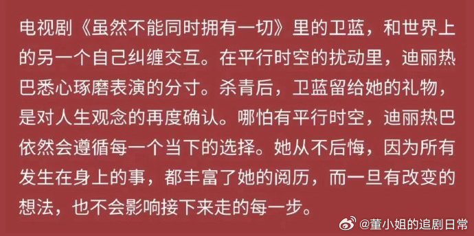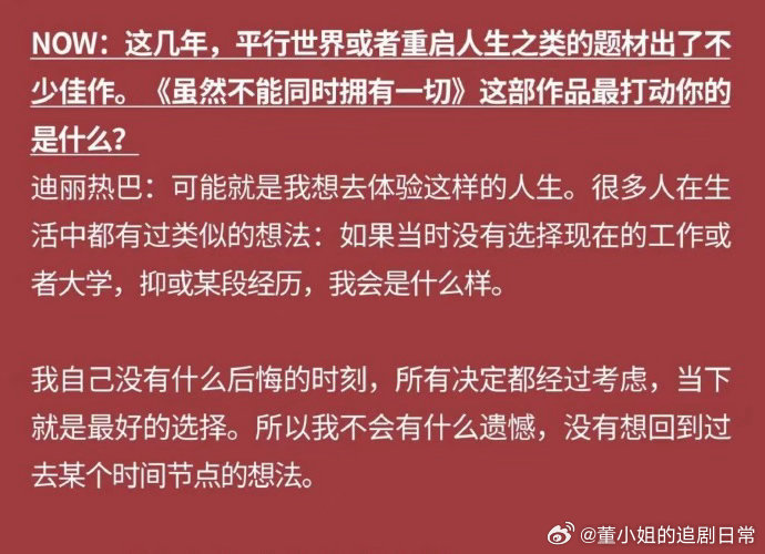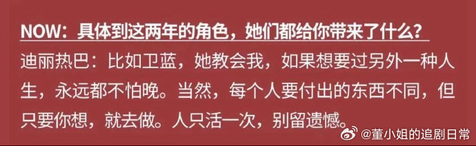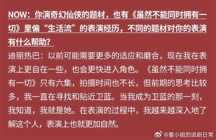 迪丽热巴迪丽热巴对表演始终保有敬畏和热爱迪丽热巴首谈卫蓝迪丽热巴坦言演员与角色是