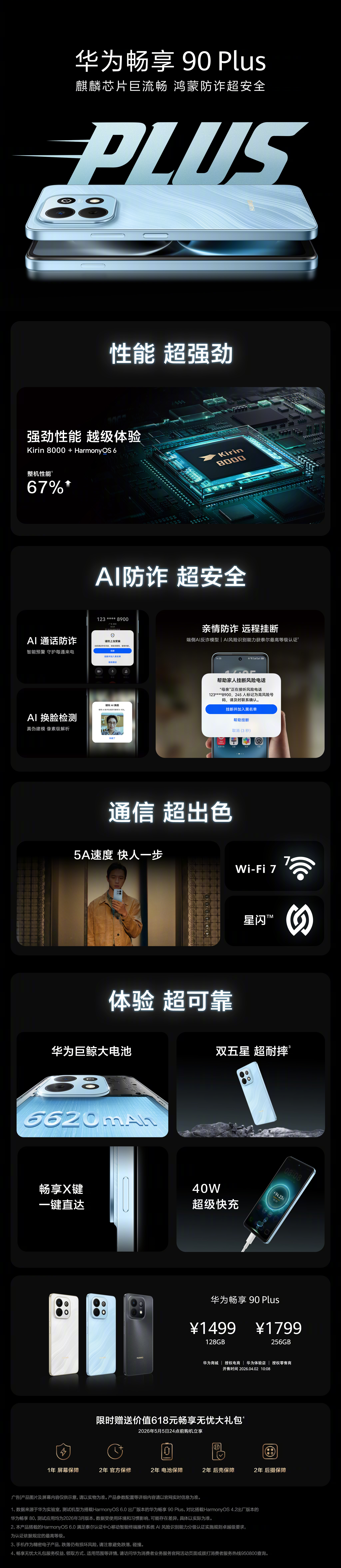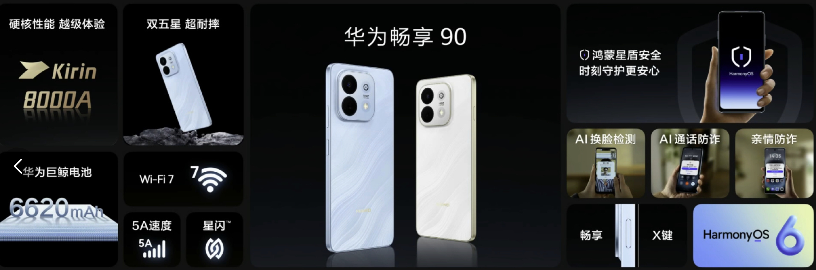 -华为畅享 90 Pro Max:8500mAh巨鲸电池、麒麟 8000芯片、方舟引擎、6.84英寸护眼屏、畅享X键、起售价1699元-华为畅享 90 Plus:6620mAh巨鲸电池、麒麟8000芯片、40W快充、AI防诈、畅享X键、起售价1499元-华为畅享 90:6620mAh巨鲸电池、麒麟8000芯片、AI防诈、畅享X键,起售价1299元