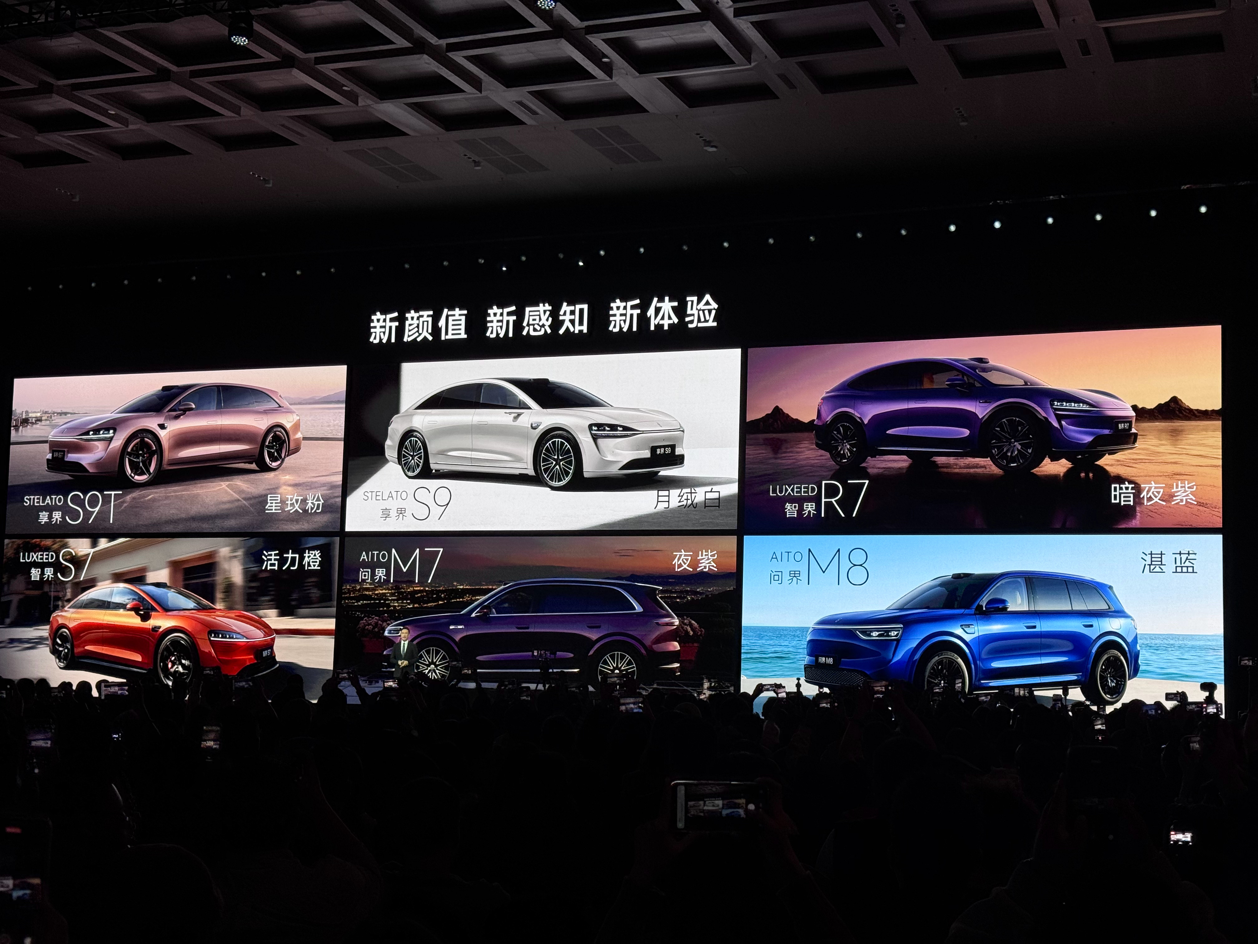 发布了很多新颜色:享界S9T:星玫粉,享界S9:月绒白智界R7&S7:活力橙,暗夜紫问界M7:夜紫,问界M8:瑞红,湛蓝