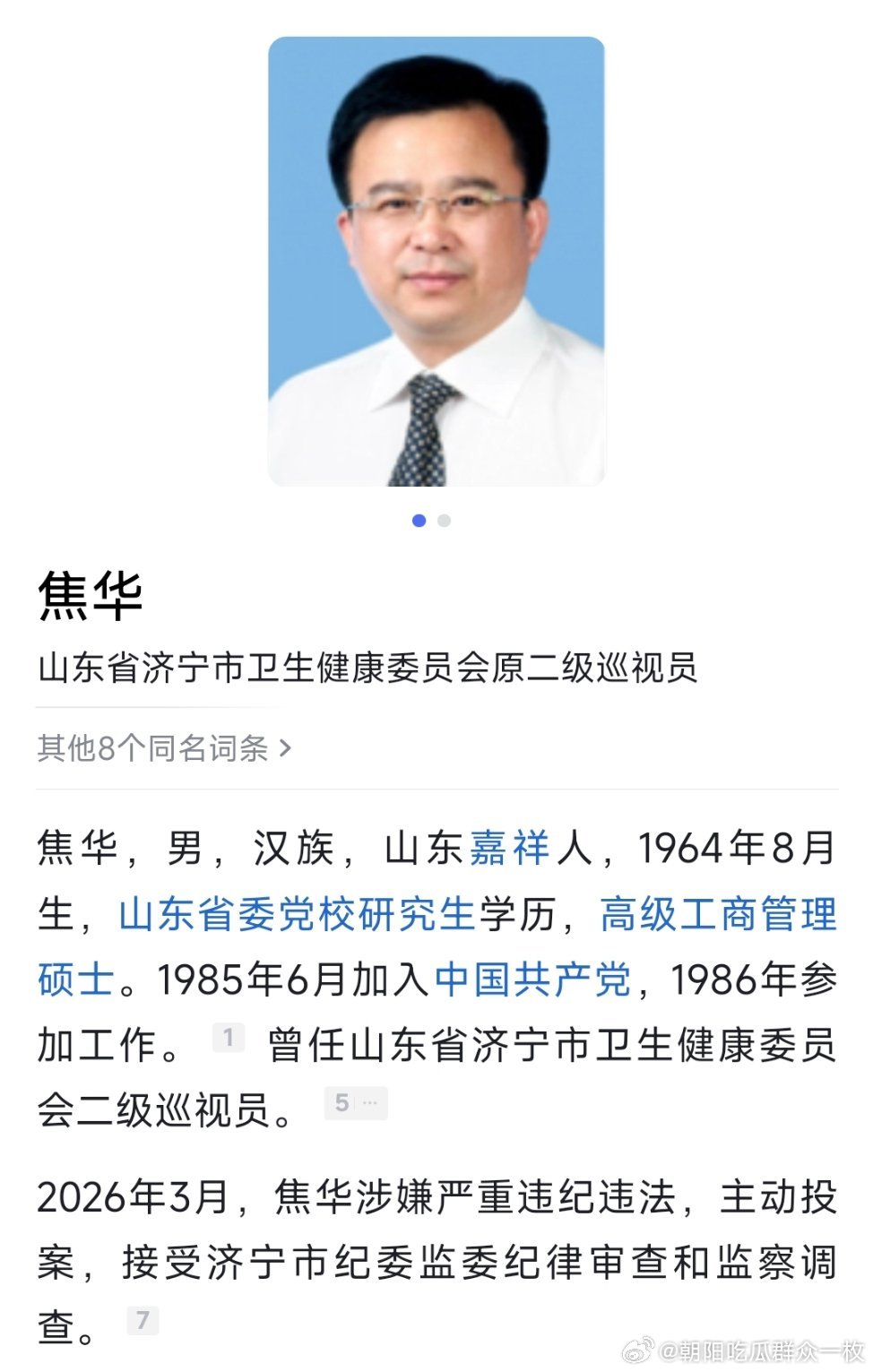 济宁市卫生健康委员会原二级巡视员焦华接受纪律审查和监察调查