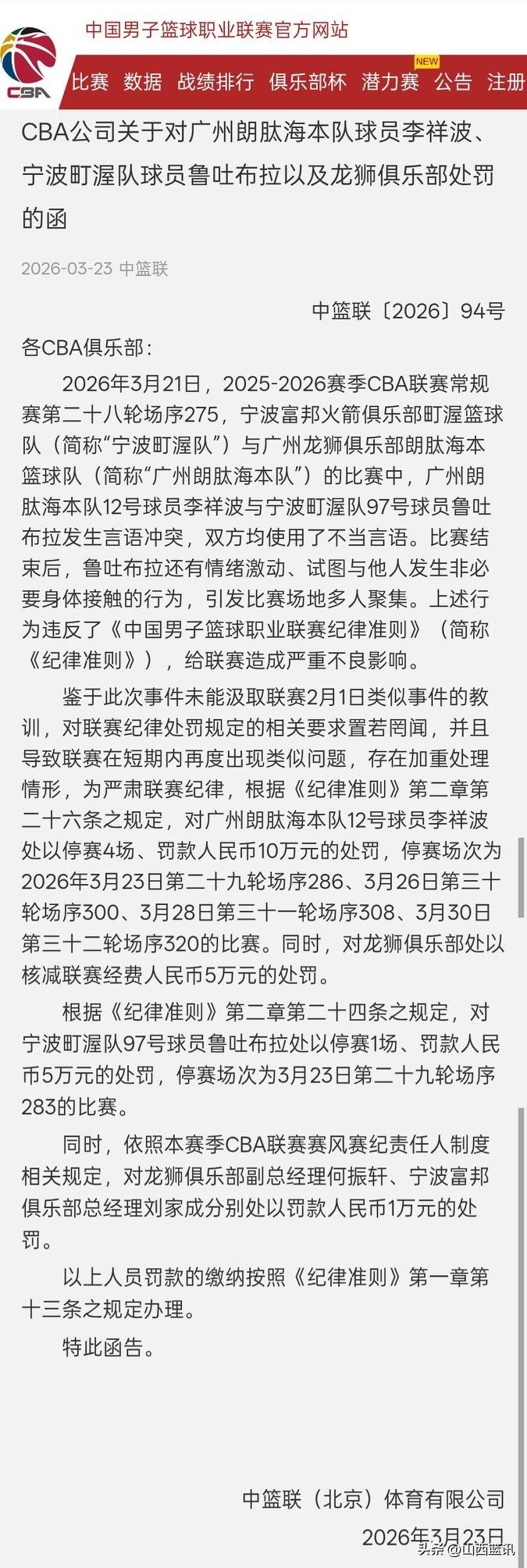 李祥波被停赛四场,山西汾酒男篮今晚战胜广州龙狮男篮迎来利好消息!李祥波今天上午还在球场踩场,为今晚与山西汾酒男篮的比赛做着热身准备。李祥波认为,随口一句“回去打馕吧”无关紧要,殊不知伤害了鲁吐布拉。当李祥波不认为自己说了有损民族团结的话,试图以“抱歉”代替“道歉”的方式蒙混过关之际,CBA公司并没有想着放过李祥波。因为皮特森数钱的事与李祥波“打馕”风波有着本质的区别。 就在李祥波跃跃欲试今晚出场迎战山西汾酒男篮的时候,CBA公司发出公告称:根据《纪律准则》第二章第二十六条之规定,给予李祥波处以停赛4场、罚款人民币10万元的处罚,对龙狮俱乐部处以核减联赛经费人民币5万元的处罚。李祥波被禁赛场次比赵睿多了一场,CBA公司指出了重罚原因:未能汲取联赛2月1日类似事件的教训,也就是赵睿嘲讽新疆球员那件事,对联赛纪律处罚规定的相关要求置若罔闻,导致联赛在短期内再度出现类似问题,所以李祥波比赵睿的禁赛3场多了一场。禁赛从今晚广州龙狮男篮与山西汾酒男篮的比赛执行。也就是说,广州龙狮男篮仅凭一个徐昕不足以抵挡山西汾酒男篮对篮筐的冲击!山西汾酒男篮尽管迪亚洛被停赛,但是取胜广州龙狮男篮的可能性大增,山西汾酒男篮迎战广州龙狮男篮确实有点好运气。不知道徐昕内心深处还有没有“抹脖子”的雄心? 与此同时,CBA公司对鲁吐布拉也处以停赛1场、罚款人民币5万元的处罚。