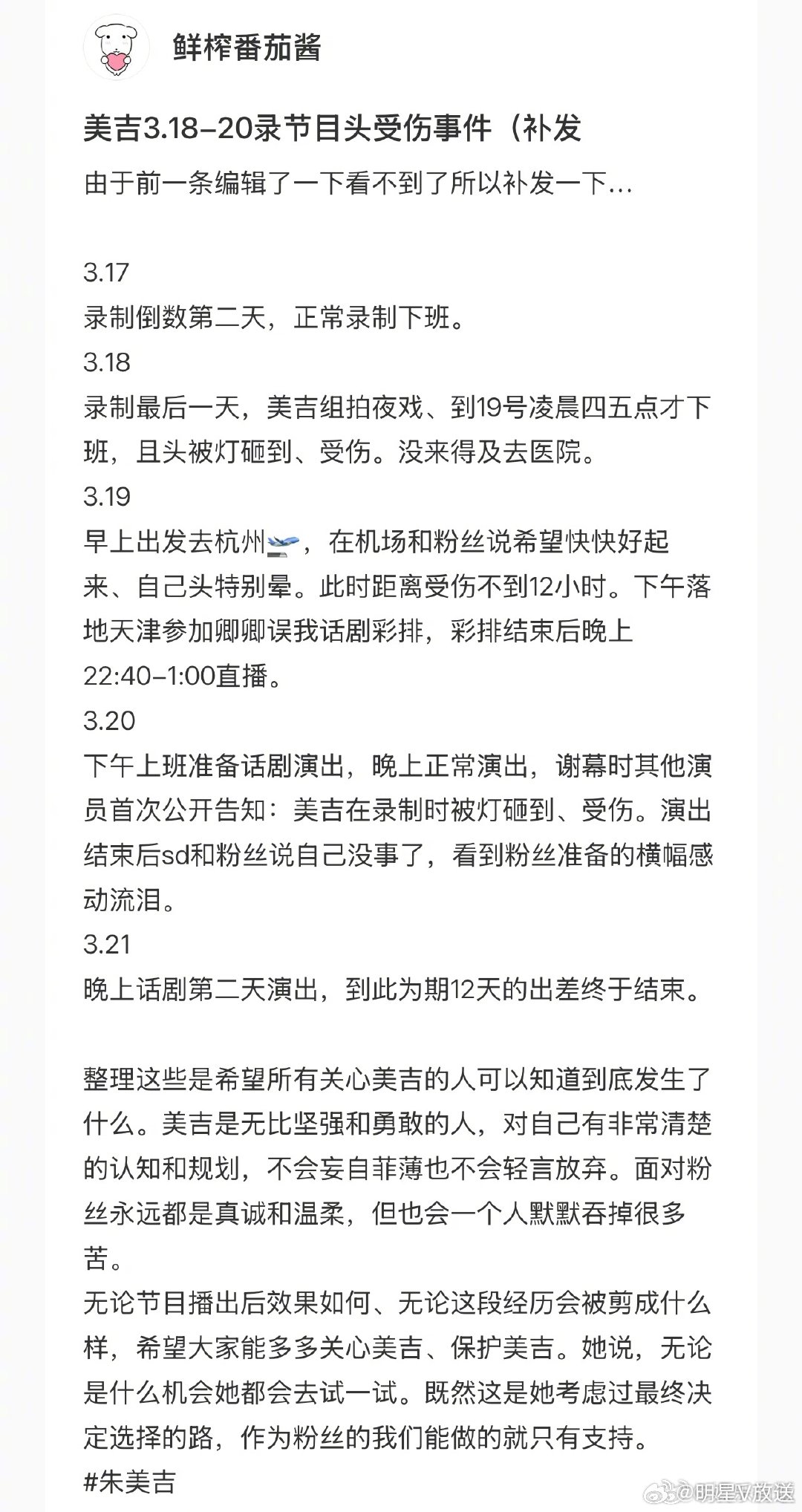 朱美吉录节目时头被灯砸伤 真的太拼太让人心疼了😭录制夜戏被灯具砸到头,明明该立刻就医,却因为满满行程硬扛着赶飞机、跨城彩排直播,全程默默隐忍不声张,直到话剧谢幕才被同伴说出伤势。带着伤痛依然稳稳完成舞台演出,不划水不敷衍,这份敬业和坚韧不是刻意卖惨,是实打实藏在细节里的责任感,愿好好休养平安痊愈🙏