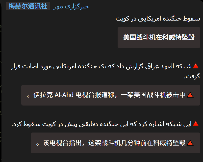 🔻伊朗梅尔通讯社、塔斯尼姆通讯社等媒体说,是来自伊拉克媒体 Al-Ahd 电视