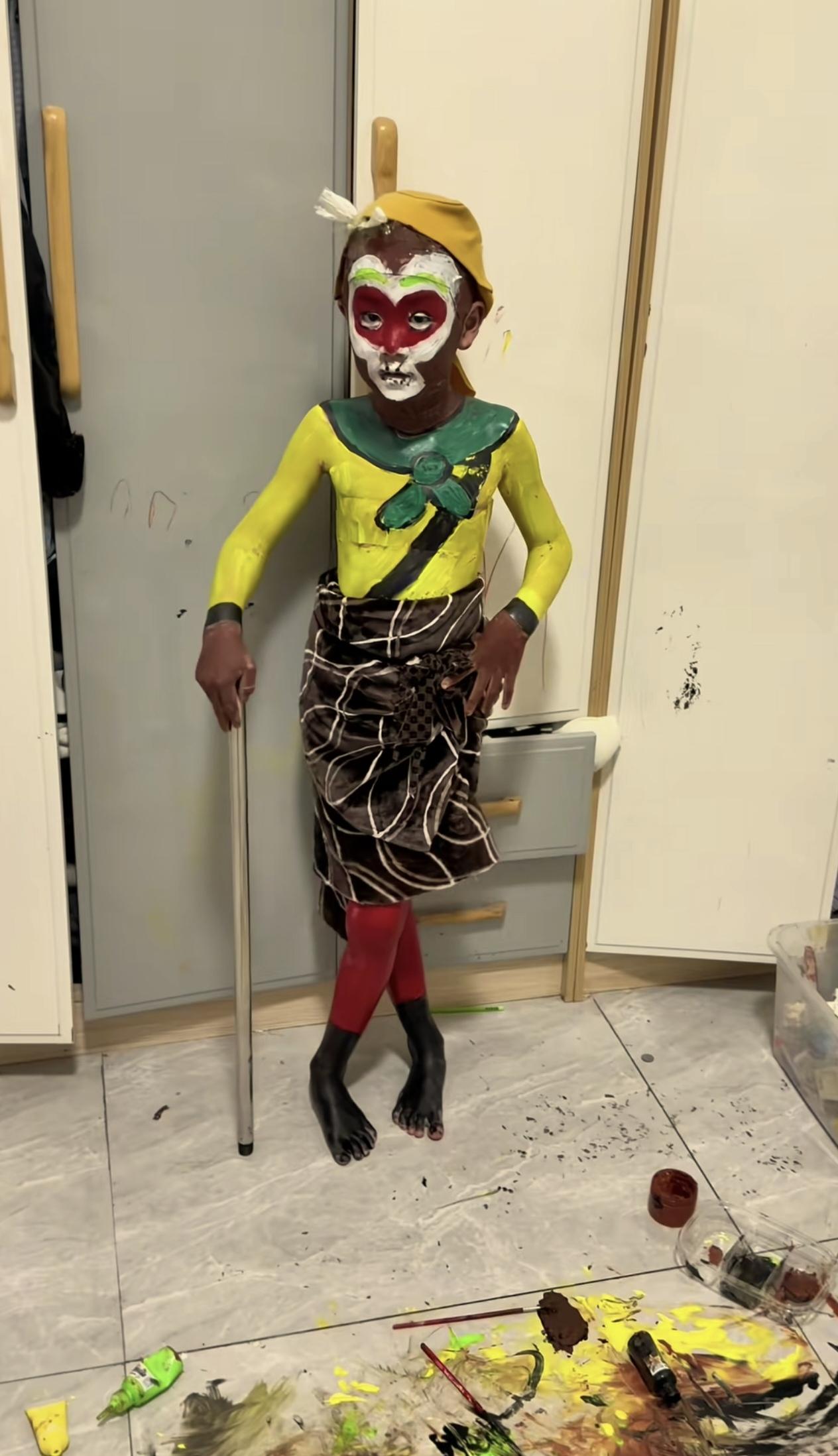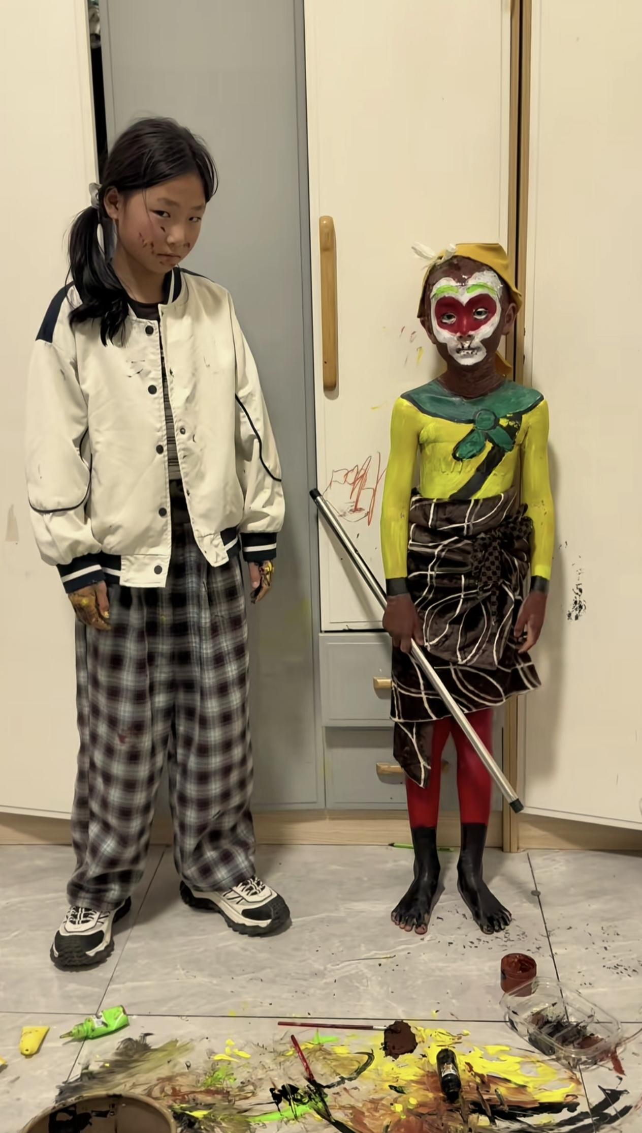 崩溃啊!真是崩溃!家长回家看到儿子被姐姐画成个猴,感觉天都塌了! 山东一家长发现两个孩子在房间里静悄悄了半天,推开房间看到姐姐在给弟弟化妆,看到这副“创作”,妈妈顿时眼前一黑。 儿子在姐姐的帮助下已经化身“孙悟空”,脸上画着猴脸妆容,身着黄衣、红裤,手持“金箍棒”,造型颇具创意。另一个孩子则专注于地面的颜料,房间里一片狼藉,地面满是各色颜料的痕迹,颜料桶、小瓶颜料散落四周,柜子上还有涂鸦痕迹。 家长既无奈又觉得好笑,只能求助网友:“这啥?悟空吗?能洗的干净不?” 不过有网友出主意:“不用洗 就让他这么去上学 估计以后一辈子都不会作妖了!”