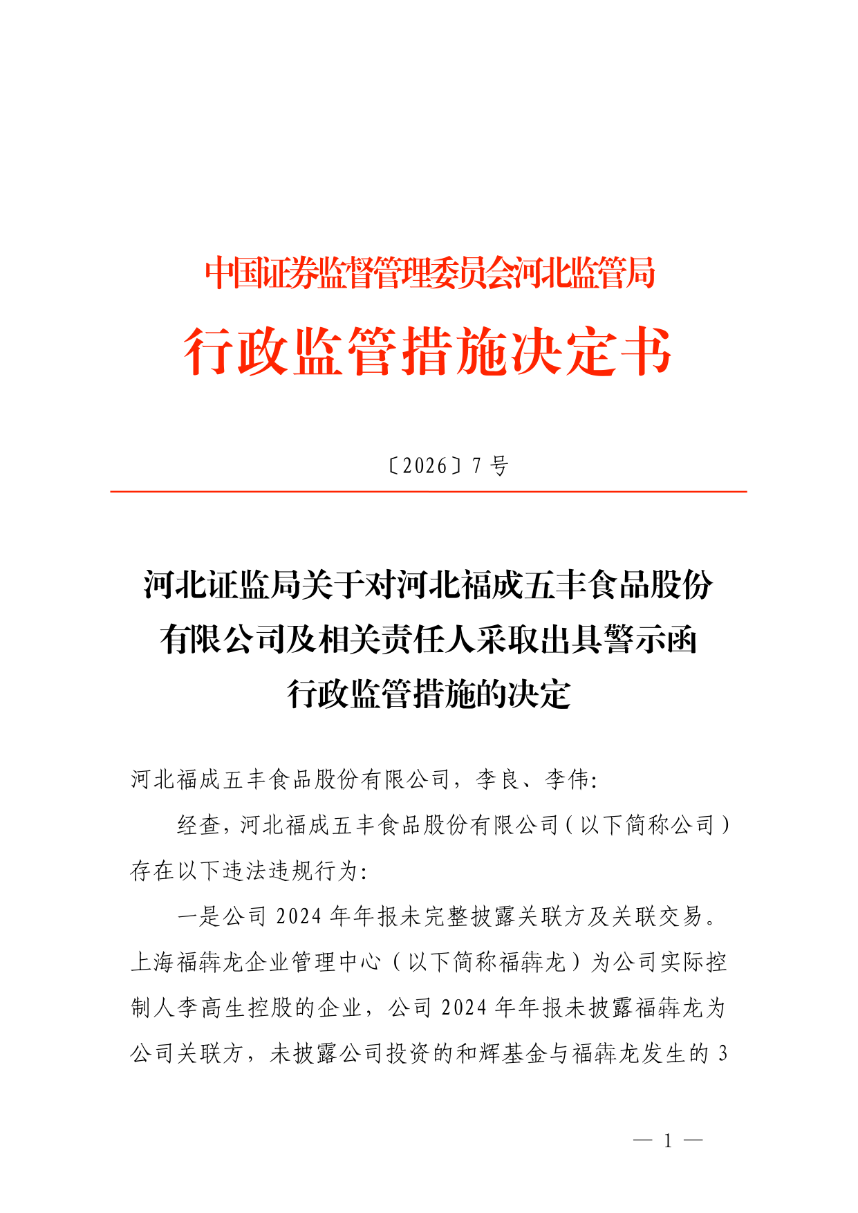对此,河北证监局决定对河北福成五丰食品股份有限公司及李良、李伟采取出具警示函的行政监管措施。