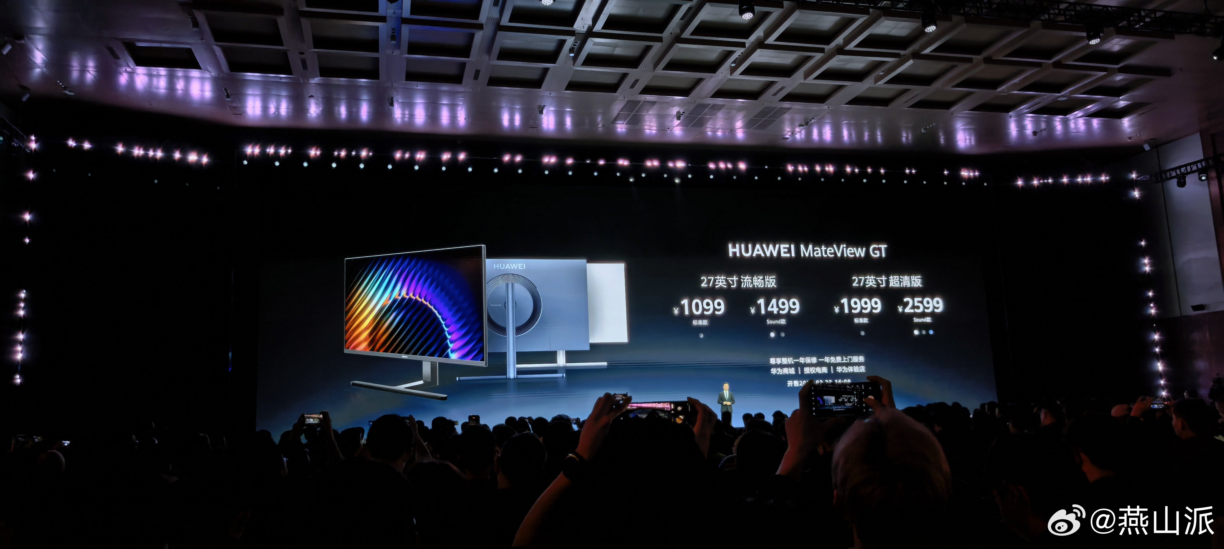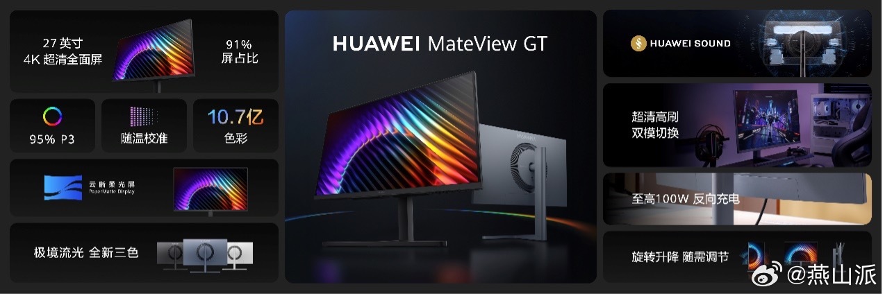 华为显示器新品强势回归!全新华为MateView GT显示器今日正式发布,售价1099元起。HUAWEI MateView GT 27英寸超清版Sound款搭载4K云晰柔光屏,具备抗眩光、抗反射及抗指纹性能;拥有91%高屏占比,最高支持4K分辨率160Hz刷新率或1K分辨率320Hz刷新率,覆盖95% P3色域及100% sRGB色域,可呈现10.7亿色的生动画面。音效方面,该显示器支持华为悦彰音效,采用4.1声道,内置5单元扬声器。此外,该显示器还集成多项游戏辅助功能与技术,包括双模刷新率切换、暗阶增强、动态准星及Adaptive-Sync技术,能多方位满足办公游戏等多场景需求。 华为春季全场景新品发布会