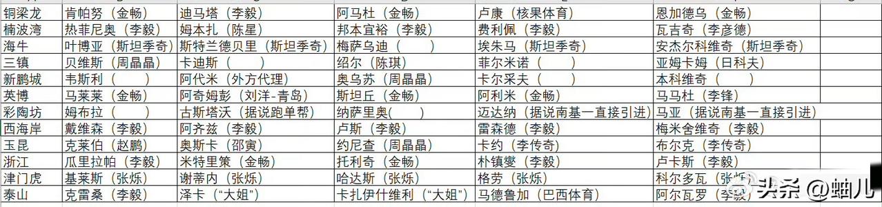 破案了!天津津门虎的外援都是同一个经纪人介绍来的,他还是天津球迷的老熟人,于根伟前队友。 张冰律师公布了几支中超球队外援的经纪人,有几支球队的外援几乎都是同一个经纪人。像青岛西海岸五个外援的经纪人都是李毅,而且辽宁铁人身价最高的外援热菲尼奥的经纪人也是李毅,山东泰山的经纪人也是李毅。 另外著名经纪人金畅代理的外援也不少,像大连英博的马莱莱,斯坦丘,阿利米。重庆铜梁龙的外援经纪人几乎都是金畅。 天津津门虎的5名外援经纪人是张铄,他是前天津泰达的球员,他和于根伟曾经是队友(有消息说他是于根伟前妻的弟弟,但未经当事人证明),本赛季津门虎的外援都非常低迷,不少球迷认为新赛季引进的三名外援水平有限,是球队成绩不好的原因之一。