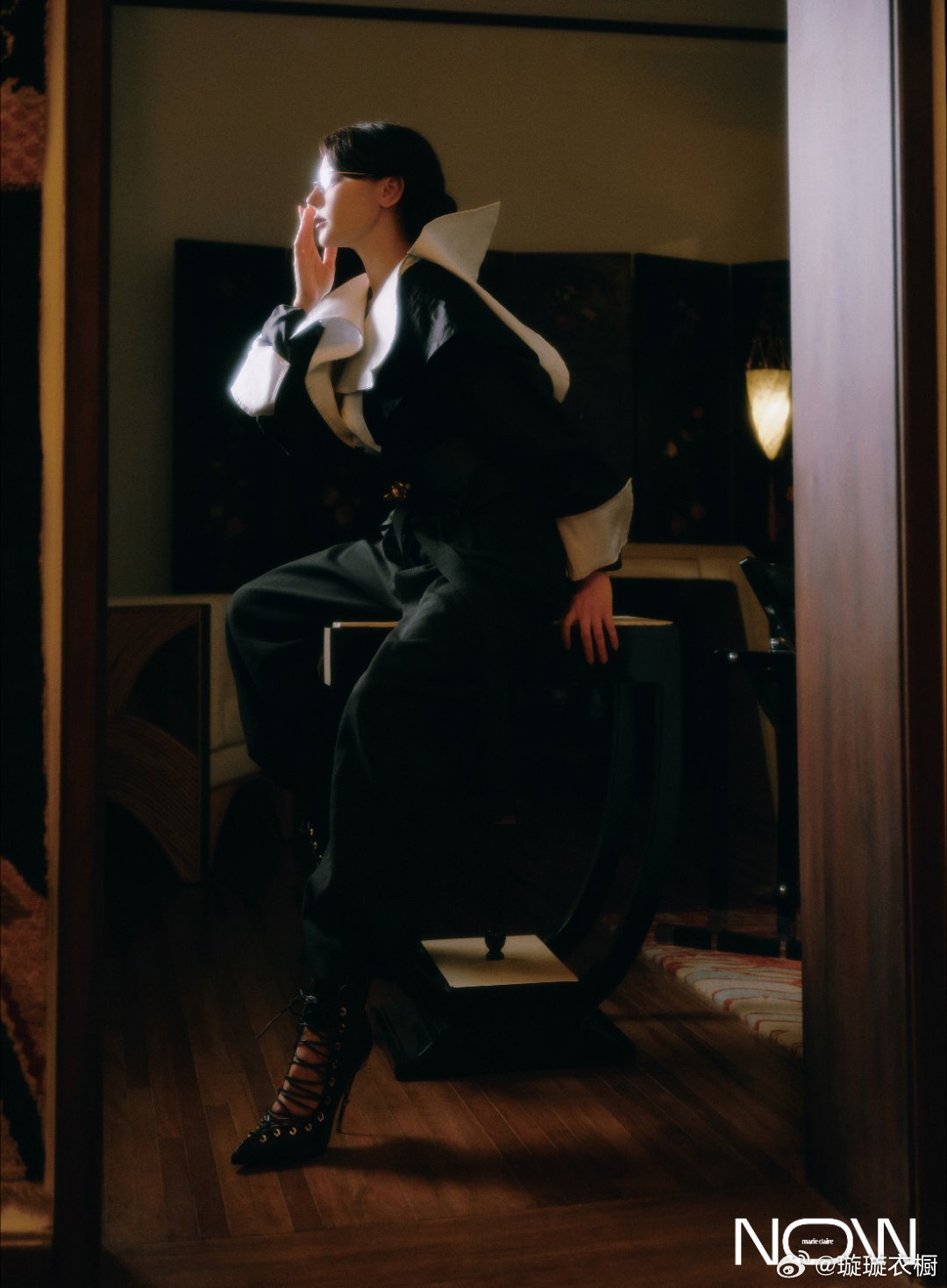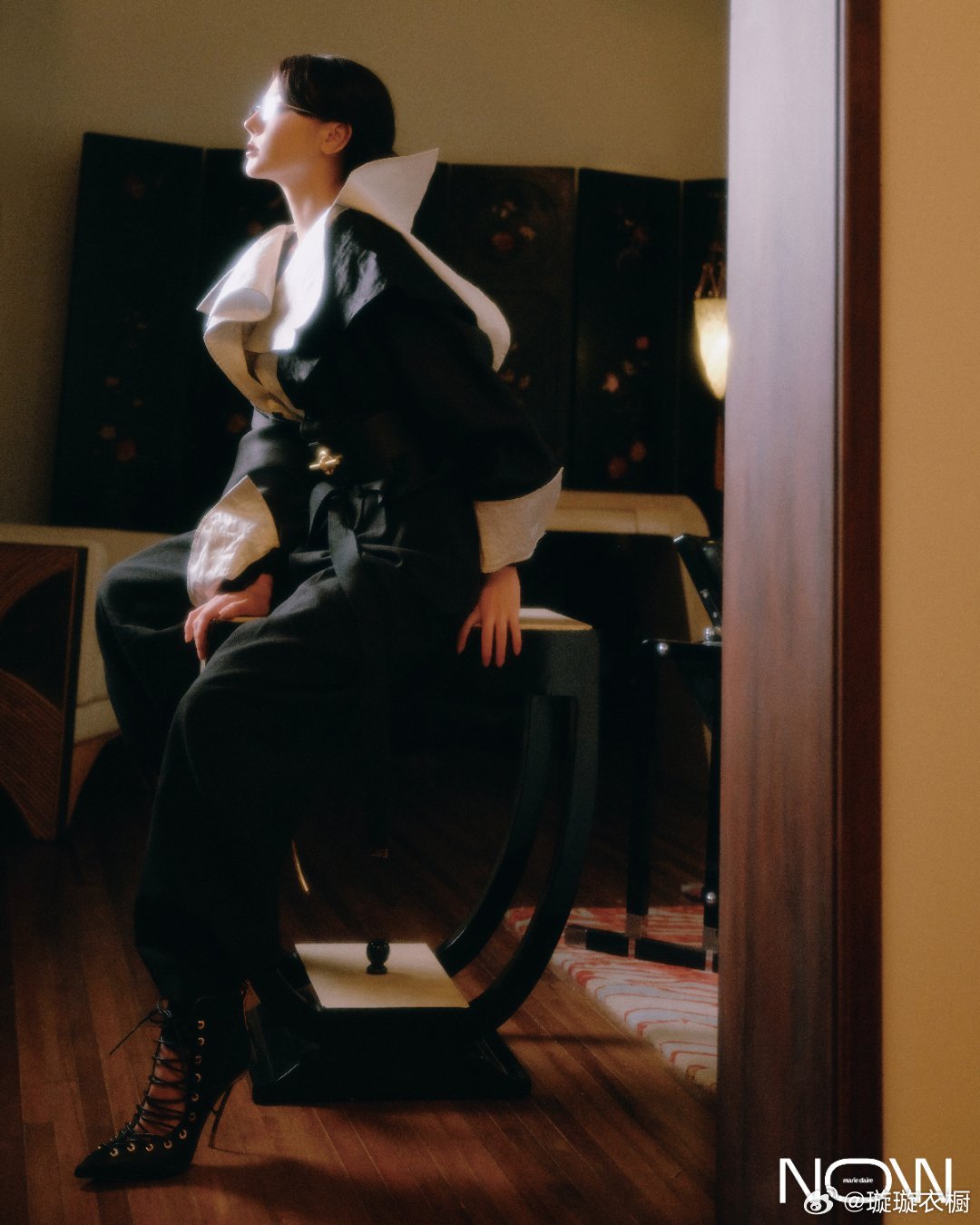 迪丽热巴珍珠缠绕指尖似星河倾泻裙摆铺开如暮色浸染的绸缎。黑与粉交织成时光的变奏,每一帧都是优雅的诗行。迪丽热巴与角色同行大片