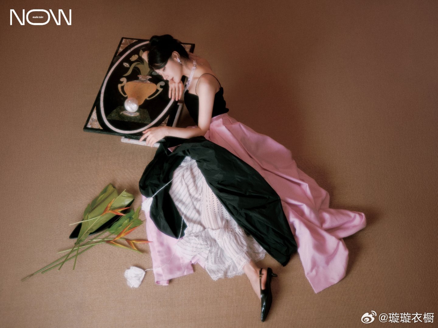 迪丽热巴珍珠缠绕指尖似星河倾泻裙摆铺开如暮色浸染的绸缎。黑与粉交织成时光的变奏,