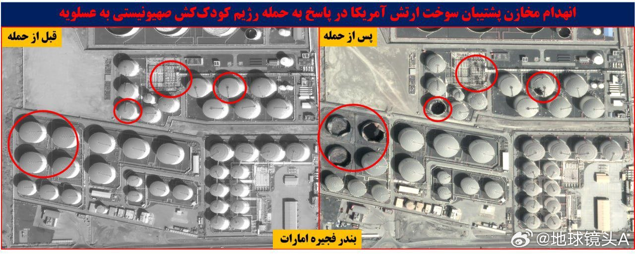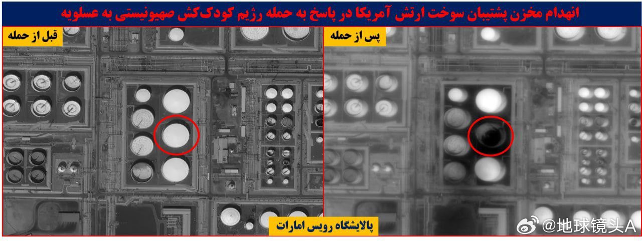伊朗称霍尔木兹海峡对所有人开放 根据伊朗方面发布的卫星照片。拦截率高达150%-200%的阿联酋防空系统表现出色:1,阿联酋富查伊拉港的燃料储存泵站遭到了破坏。2,位于阿联酋拉巴赫和阿布扎比的美国军队备用数据中心被击中。3,沙特阿拉伯东北部拉夫哈/盖苏马附近的AN/FPS-117预警雷达站被彻底摧毁。4,阿联酋阿萨卢耶炼油厂的美国军事燃料供应管线被严重破坏。5-9,阿联酋阿萨卢耶炼油厂的燃料储存罐和泵站等能源遭到严重破坏。