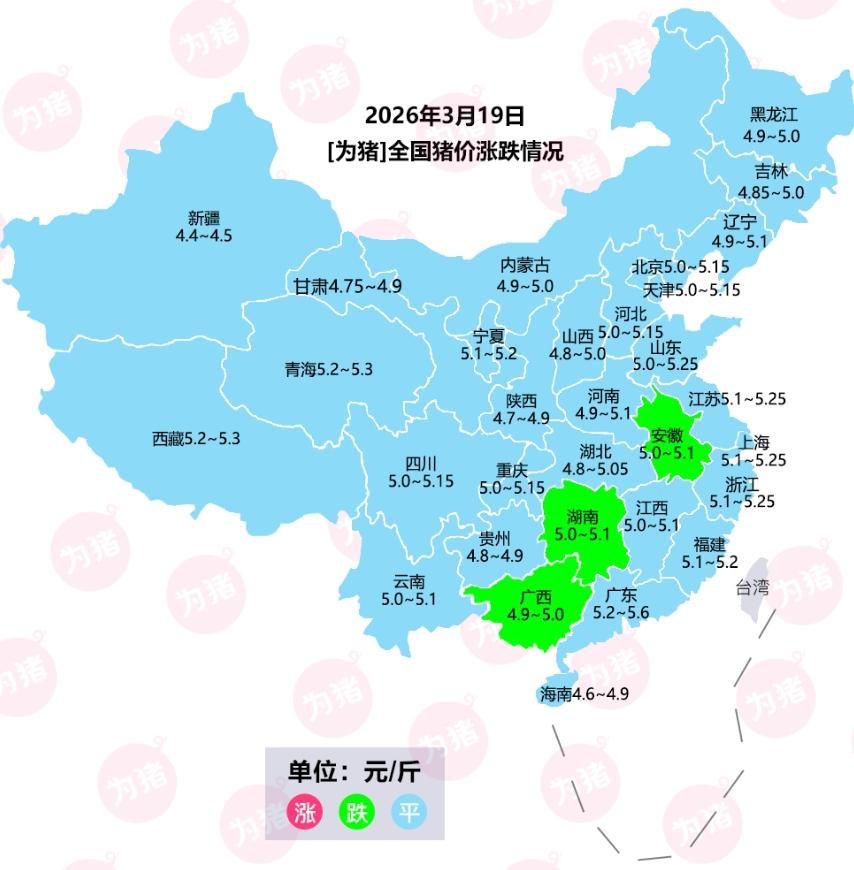 3月19日猪价 | 市场情绪较差,猪价继续磨底! 今日全国生猪收购均价呈现下跌态势,全国外三元标猪均价5.00元/斤,环比昨天下跌0.02元/斤,上涨地区0个,下跌地区3个,稳定地区25个,全国生猪收购最低价为新疆,价格为4.4元/斤,最高价为广东,价格为5.6元/斤。 一头标猪亏损在250-300元。近期二育进场对大场小标猪支撑了一下,但奈何猪企出栏增量,猪价继续下调,主要以小幅下跌为主。目前河南猪企125-140公斤已经跌破10元,成交9.9元。广东猪企挂牌稳定在11.2元,但成交一般。不论生猪期货盘面还是现货,情绪都在走差。各位养猪老板们,你们那边有二育入场吗?欢迎大场在评论区留言。