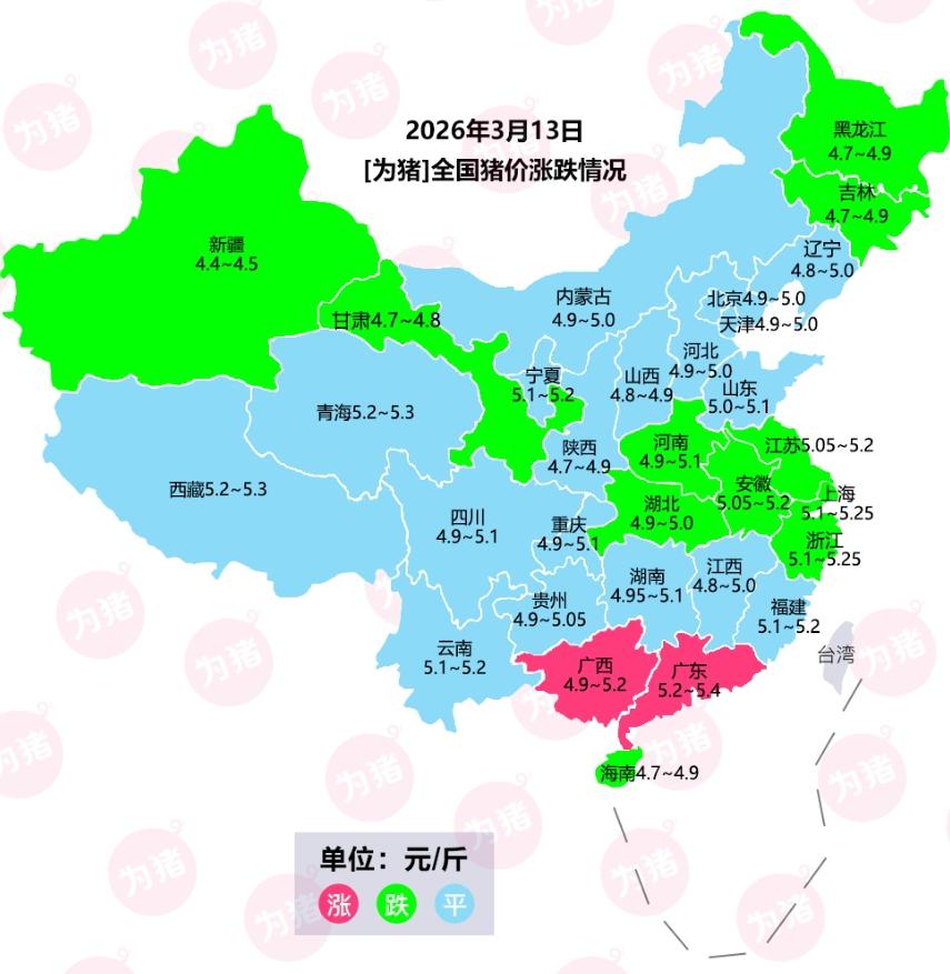 3月13日猪价 | 全国均价来到5元,广东大场上涨2毛! 今日全国生猪收购均价呈现下跌态势,全国外三元标猪均价5.00元/斤,环比昨天下跌0.01元/斤,上涨地区2个,下跌地区11个,稳定地区15个,全国生猪收购最低价为新疆,价格为4.4元/斤,最高价为上海,价格为5.4元/斤。 两广猪价出现上涨,广东大场上涨1毛,其他地区依旧稳中偏弱,均价以上跌破5元,全国多地低价区报价已经到4字开头,今日河南一哥出栏价格下调5分到1毛,成交价格在5块1左右,广东大场上涨2毛,成交价格5块5,目前仅剩中部高价地区在5块以上,散户大场全部亏损,猪价想上涨还需要支撑,养猪的老板们你们那边今天300斤的大猪什么价格,欢迎在评论区留言。
