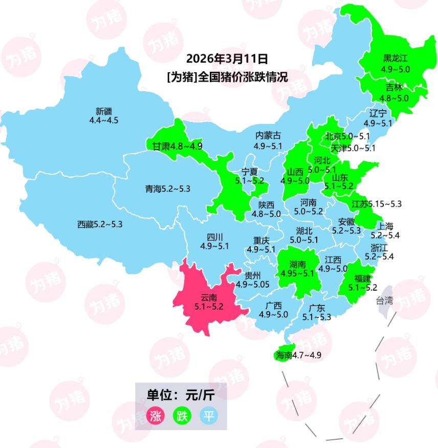 3月11日猪价 | 稳中调整,短期弱势难改! 今日全国生猪收购均价呈现下跌态势,全国外三元标猪均价5.04元/斤,环比昨天下跌0.03元/斤,上涨地区1个,下跌地区12个,稳定地区15个,全国生猪收购最低价为新疆,价格为4.4元/斤,最高价为上海,价格为5.4元/斤。 猪价继续向下,均价坡5大概率会出现,另一方面,饲料原料价格上涨,饲料企业纷纷提价,养猪成本增加,猪价却还在下跌,部分地区已经破5,今日河南一哥出栏价格稳定为主,部分偏弱5分调整,广东大场继续稳定在5块4左右,目前猪价小体重高于大体重,标肥倒挂,散户今日稳定 为主,大场散户全部处于亏损之中,短期猪价难改弱势行情,各位养猪老板你们那边有二育入场吗,欢迎大家在评论 区留言。