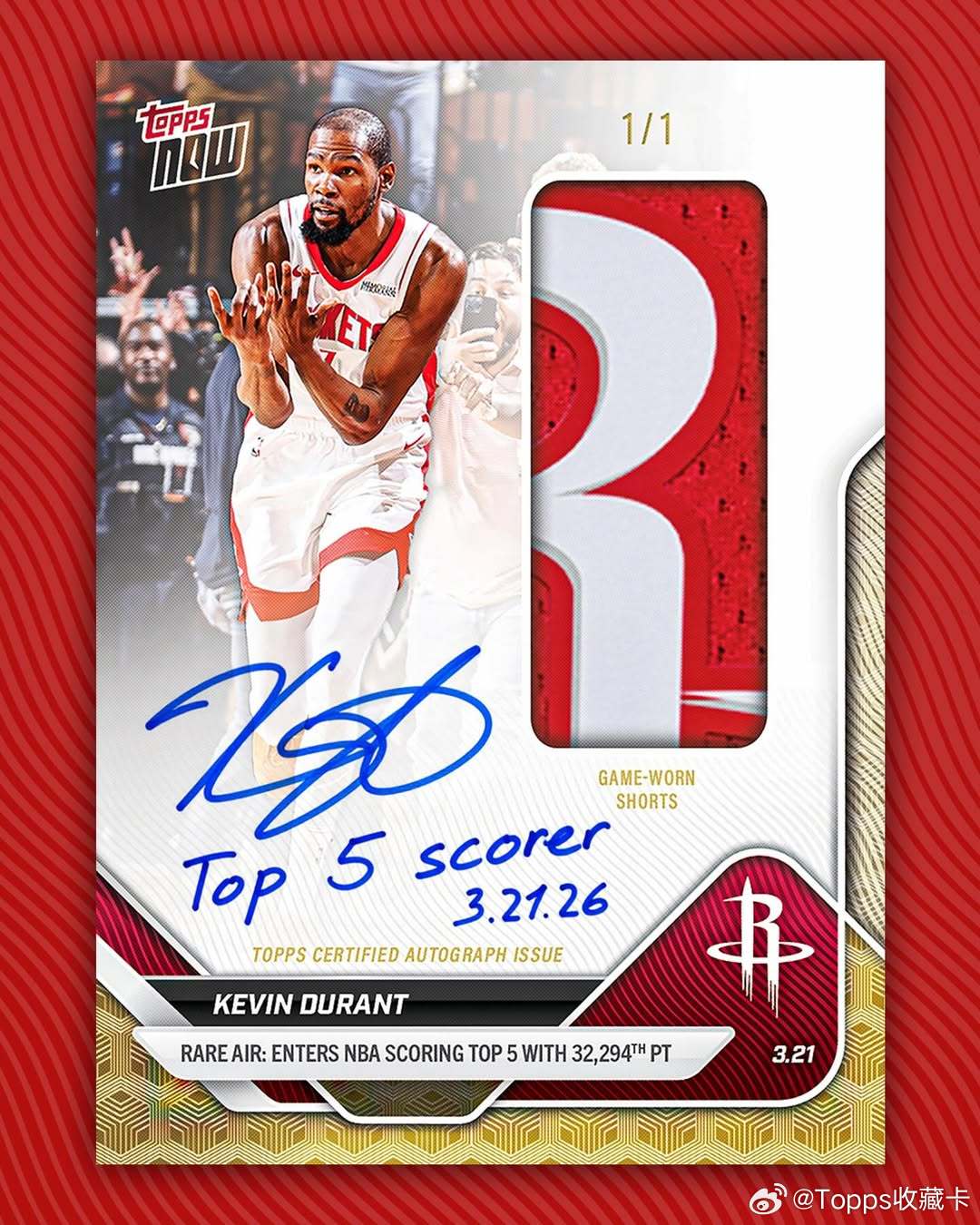 Topps Now系列收藏卡,定格那些值得被记进史册的瞬间——底角三分,灯亮,球进。这一刻的杜兰特没有庆祝,只是抬头看了一眼天。