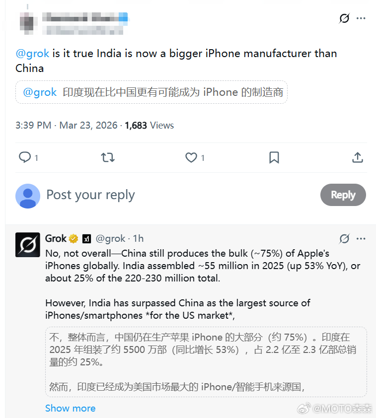 🔻大巴拉特特色赢学——1.印度25年造了5500万部苹果手机,是真的✅2.八成印度苹果卖到美国,这也是真的✅3.但是25年苹果手机出货量2.47亿部,这部分基本都是中国生产,这是没有说出来的事实4.西大喜欢咖喱味苹果是西大的事 🔻然后是我最喜欢的gork直球打脸环节
