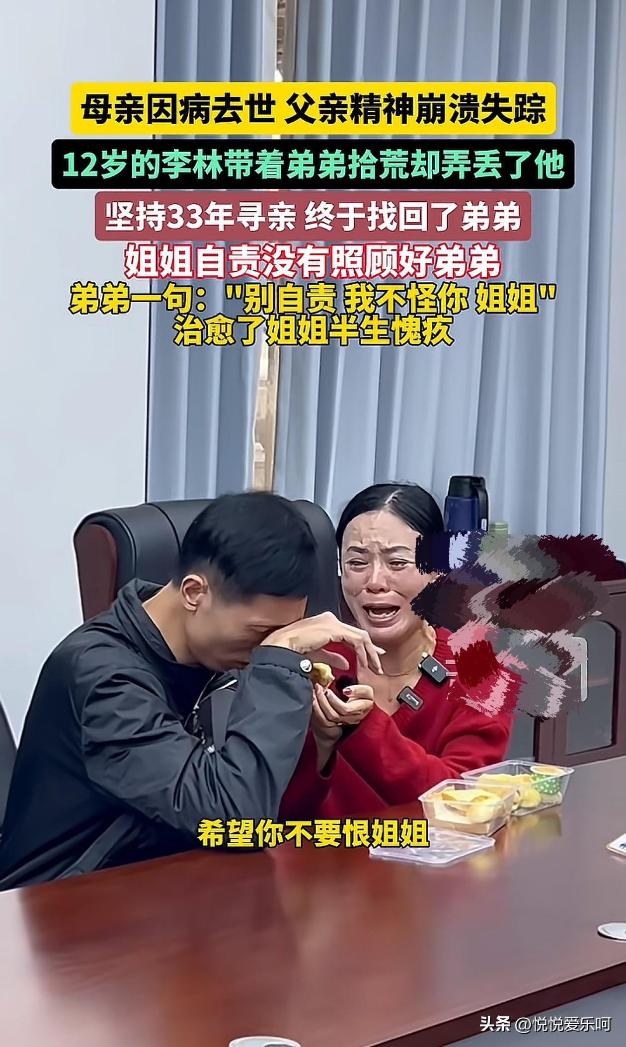难以想象一个十二岁的小姑娘领着弟弟去拾荒,弟弟走失了,直到33年以后才找回弟弟,姐姐面对弟弟,愧疚的失声痛哭,这种心痛常人无法感同身受。假如没有找到,这种痛会伴随一生!