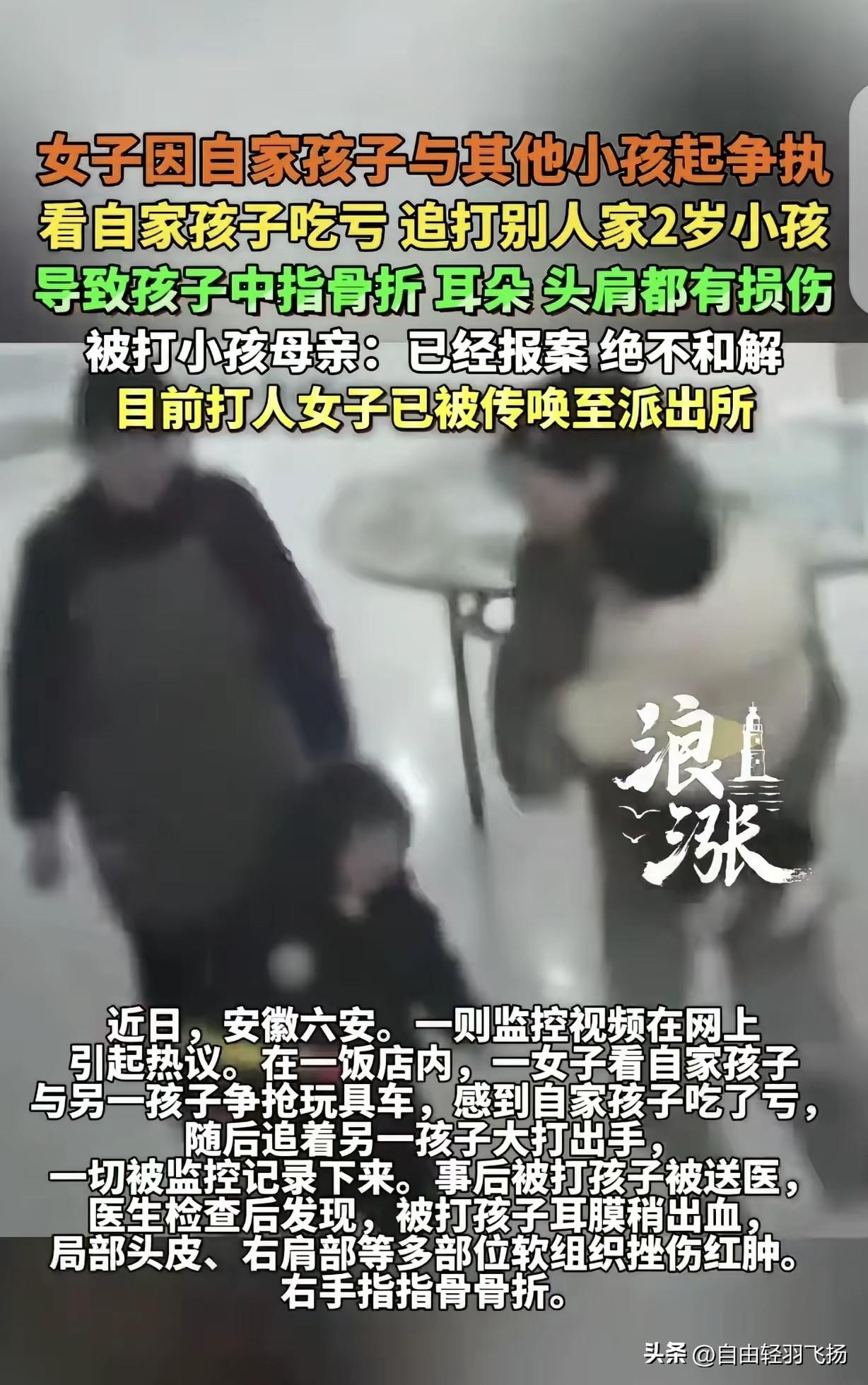 你能想象吗?仅仅因为两个孩子争抢玩具,一位成年妈妈竟会对一个两岁幼童痛下狠手,将其打得手指骨折、耳膜出血! 更令人愤慨的是,事后她不仅毫无愧疚之意,还妄图仗着人多势众来掩盖自己的恶行,最后见事情闹大了,居然只拿出1000块钱就想私了,这简直是对受害者的二次伤害,其行为实在是毁三观至极! 事情发生在2026年3月19日中午的安徽六安一家饭店内。当时,饭店老板2岁的女儿正开心地玩着自己的粉色扭扭车,那可爱的模样,仿佛是这饭店里的一抹温暖阳光。 然而,这份美好却被突然打破,一名白衣女子带着孩子前来吃饭,她家孩子一眼就相中了那辆扭扭车,二话不说便冲过去抢夺。 小孩子嘛,对喜欢的玩具总是充满占有欲,黑衣女童自然不肯轻易相让。于是,两个孩子之间便有了小小的争执,这在幼儿之间本是再正常不过的事情,就像天空中偶尔飘过的一片小云朵,很快便能消散。 可谁能想到,接下来发生的一幕,会如此令人痛心和愤怒。 白衣女子看到自己的孩子被抓伤后哭了出来,瞬间就“炸毛”了。她没有像正常家长那样,赶紧拉开孩子,教导孩子要懂得分享和谦让。 也没有向对方家长表示歉意并安抚孩子,而是将所有的怒火都发泄到了那个年仅2岁、毫无反抗能力的黑衣女童身上。监控画面清晰地记录下了这令人发指的一幕,白衣女子抱起自己的孩子,径直走到黑衣女童面前,抬手就狠狠地抽打孩子的小手。 那可不是轻轻的拍打,而是带着怒气的重重击打,一下又一下,小小的孩子怎能承受这样的疼痛,当场就崩溃大哭,哭声中满是恐惧和委屈。 但白衣女子却并未就此停手,她像是被愤怒冲昏了头脑,抱着孩子再次冲上前去,竟然直接抬手扇孩子的耳光,动作之快、下手之狠,让人看得触目惊心。 一个两岁的孩子,体重不过三十斤左右,走路都还摇摇晃晃,在她面前,白衣女子是如此高大强壮,可她却毫不留情地对孩子施暴。那稚嫩的小脸,那弱小的身躯,在暴力面前是那么无助,让人看了心疼不已。 直到店主夫妇听到孩子撕心裂肺的哭声,从后厨匆匆赶来,这场噩梦般的暴力才终于停止。店主夫妇起初还以为只是孩子之间的小打小闹,可当他们调出监控,看到事情的真相后,顿时气得血压飙升。 自己捧在手心里疼的宝贝,平日里连重话都舍不得说一句,如今却被一个陌生女子如此殴打,哪个父母能受得了这样的事情? 他们找到白衣女子,希望对方能给个说法,哪怕是一句道歉,他们或许还能稍微平息心中的怒火。可白衣女子的做法,却再次刷新了人们对“蛮不讲理”的认知。 她不仅没有半点愧疚之情,反而理直气壮地打电话,叫来了一大群家属。不一会儿,饭店前台就被围得水泄不通,全是她的家人。 这些人你一言我一语,对着店主夫妇大声叫嚷,甚至颠倒黑白,把自己说成是受害者,那副嚣张跋扈的模样,让人不禁想问:“你们的良心难道不会痛吗?”。 店主夫妇面对这群蛮不讲理的人,深知讲道理已经没用,果断选择了报警。与此同时,被打女童一直哭着喊手疼、耳朵疼,家人不敢有丝毫耽搁,立刻带孩子去医院检查。 而检查结果,让每一个人都感到无比心疼:孩子的右手中指指骨骨折,需要承受骨折的剧痛;右侧耳膜出血,可能会留下后遗症;头皮、右肩部、右手背等多处软组织挫伤红肿,那一道道伤痕,仿佛是刻在家人心上的痛。 白衣女子被警方传唤后,一开始还百般抵赖,死活不承认自己打了孩子,试图蒙混过关。但监控就是铁证,在事实面前,她最终无话可说,随后被依法行政拘留。 此时,她才终于知道害怕,才想起要解决问题,托人提出赔偿1000元,希望能与受害方和解。可这1000元,能弥补孩子身体上的伤痛吗?能抚平孩子心灵上的创伤吗?能让店主一家心中的愤怒消散吗? 答案显然是否定的,这不是赔偿,而是对受害者的又一次伤害,是对法律和道德的漠视。 随着事件在网上的发酵,打人女子的更多信息被网友扒了出来。 据说她今年26岁,外表看起来斯文秀气,还戴着眼镜,平日里给人一种知书达理的感觉,甚至网传她还是当地一所学校的教职工。 这就让人更加难以理解了,作为一名可能为人师表的人,本应教书育人,以身作则,传递爱与善良,可她却做出如此残忍之事,如何能配得上“老师”这个神圣的职业?如何能让家长们放心地把孩子交给她?。 被打女童的妈妈看到白衣女子方面提出的“1000元私了”提议,忍无可忍,公开发声表示:警方已拘留对方,案件正在依法处理,自己坚决不和解,一定要让施暴者付出法律代价! 她的这一态度,得到了全网网友的一边倒支持。大家纷纷留言:“对这样的人,绝对不能原谅,必须让她受到法律的严惩,给孩子一个公道!”“1000元就想了事,简直是天方夜谭,她的行为已经构成了犯罪,必须承担相应的责任!”。 我们在疼爱自己孩子的同时,也要尊重他人的孩子,因为别人家的孩子,同样是父母捧在手心的宝贝。