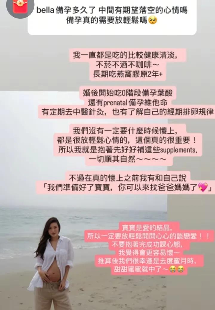 Bella居然已经怀孕21周了真看不出来,她的丈夫居然是美籍华裔设计师,其实也不比前任高以翔差。 高以翔是艺人,具有颇高的知名度,而Bella的老公也是圈外人,却与高以翔一样都是华裔。 高以翔高大帅气,从小在温哥华长大,加拿大国籍,Bella的老公公开信息很少,只公布是华裔设计师,看来Bella的眼光没有变过,依然喜欢ABC。 2023年,Bella在上海探亲时,与老公相识,她的外婆家在马鞍山,时常穿梭于上海、南京、安徽。 两人在云南大理恋爱了几年,男方在那里有民宿,环境非常静谧。Bella在那里直播,家里养了猫狗,享受生活。 同时,他们的婚礼也是在大理举行的,只邀请了为数不多的家人与好友。 外婆可能是年迈,并没有参加外孙女的婚礼,Bella的父母与哥哥定居台北。 她本人如今很少回台北,在美国与大理定居,看似非常幸福,她展现的动态也是积极正能量的。 同时,孕期也没有停止工作,一直在分享好物,Bella的铁粉很多。虽然在歌唱上没有取得成就,但作为带货主播还是不错的。 高以翔已经成为了Bella的过去式,在一方节目中,她曾表示,希望未来的另一半能够允许她的心里有前任的一席之地。 Bella的老公,至今没有曝光过正脸。 但从背影来看,也是身姿挺拔,非常有气质,两人很般配。 Bella具有小麦色的肤色,傲人的身材,她的美也许一般人欣赏不来,但作为在国外长大的高以翔来说,就是他的菜。 高以翔生前未官宣过女友,直到去世后Bella才浮出水面,他的粉丝无法接受。 因此,Bella也承受了很多,一方面是爱人的离世,心痛无助,另一方面是铺天盖地的谩骂与质疑。 如今是守得云开见月明了,愿她幸福!