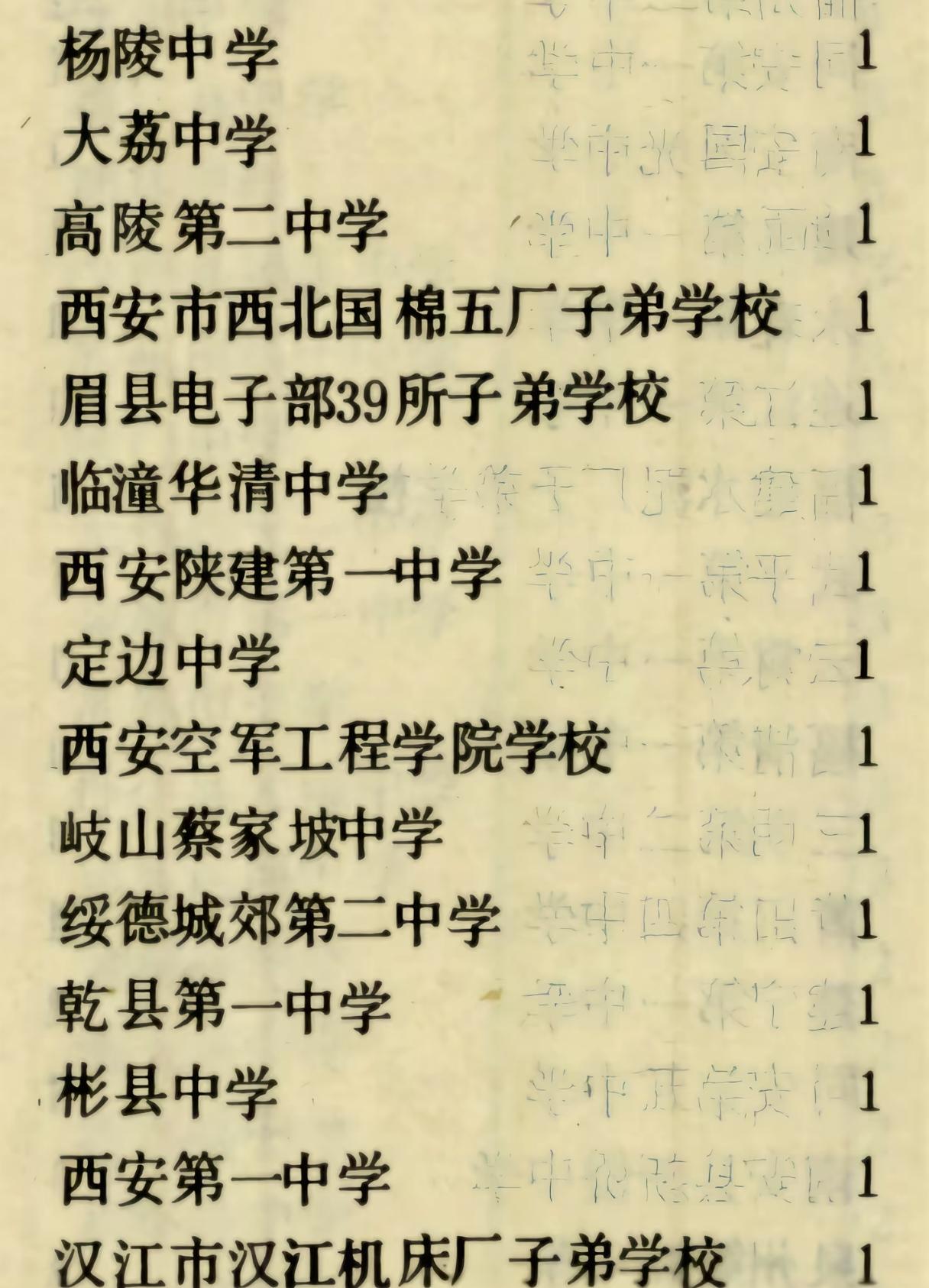 图中这是1986年清华大学在陕西的录取名单。『原来渭南教育曾经这么强悍』❗️ 当年共录取68名新生,来自47所中学。 那会还没有如今的“五大名校”霸榜现象。 那会的录取情况还是“百花齐放”的状态。 那会的渭南地区教育太厉害了,甚至比起省会西安都不遑多让。 名单首页共列34名,渭南地区竟然占道12名,占总数三分之一强。 首页渭南五所中学入围,可见渭南地区当时教育实力之强,学风之浓。 时过境迁,如今合阳县黑池中学已不存在,但是其他四所中学依然存在,虽然已不负当年之勇,但是依然努力传递着秦东教育的薪火。 各位乡党们,这份名单里有你曾经的母校吗?你还了解哪些有趣的陕西高考往事?