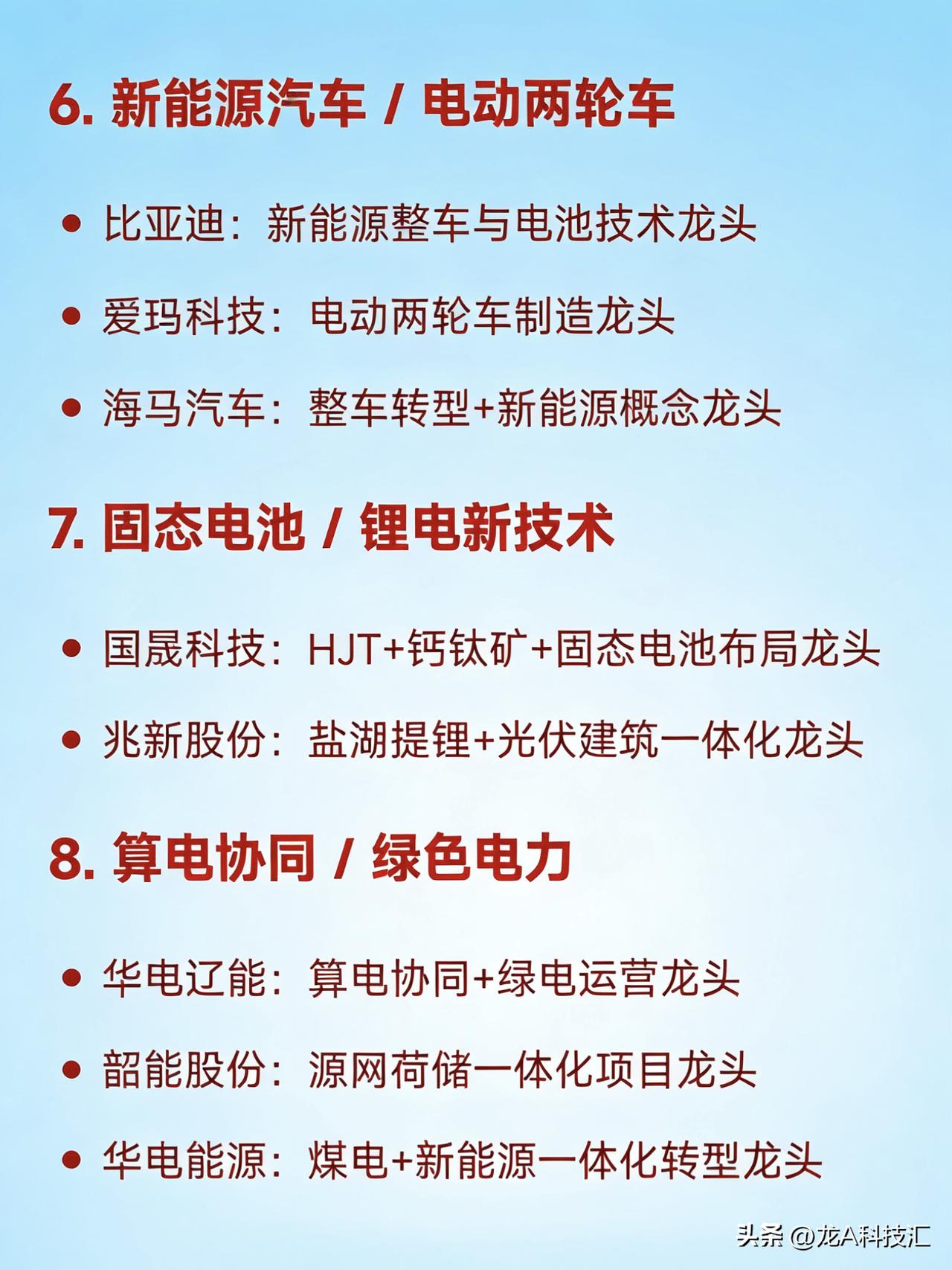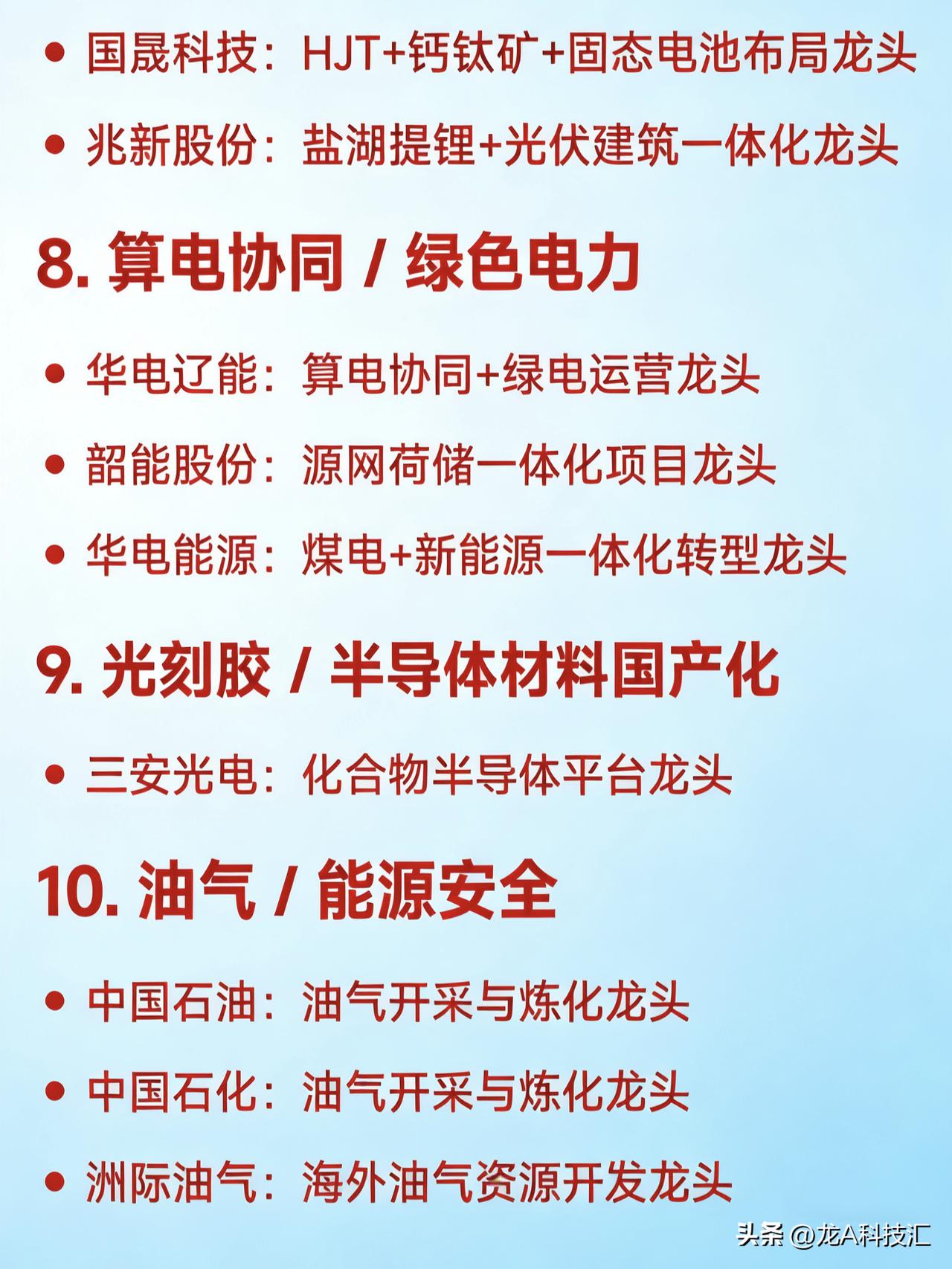 2026年3月23日十大热点科技及其产业链核心龙头 1. 光伏 协鑫集成:光伏组件与N型技术龙头 中利集团:钙钛矿/TOPCon电池概念龙头 拓日新能:光伏电力设备龙头 东方新能:新能源电站运营商龙头 浙江新能:绿电+光伏综合运营龙头 华民股份:光伏+人形机器人跨界龙头 上能电气:光伏逆变器全球出货龙头 2. 储能 正泰电源:储能系统集成龙头 立新能源:风电+储能一体化龙头 芯能科技:分布式储能应用龙头 上能电气:储能变流器国内领先龙头 3. 人形机器人 / 具身智能 宇树科技:人形机器人整机龙头 中大力德:机器人精密传动龙头 金发科技:机器人结构材料龙头 首开股份:机器人+地产融合概念龙头 4. AI算力 / 太空算力 / 智算中心 顺灏股份:太空算力概念龙头 杰美特:边缘算力+东数西算龙头 瑞斯康达:CPO+算力网络设备龙头 华胜天成:国产算力基础设施服务龙头 5. 煤炭 / 煤化工 云煤能源:西南煤化工龙头 辽宁能源:东北热电+煤炭一体化龙头 金煤科技:煤化工新材料龙头 6. 新能源汽车 / 电动两轮车 比亚迪:新能源整车与电池技术龙头 爱玛科技:电动两轮车制造龙头 海马汽车:整车转型+新能源概念龙头 7. 固态电池 / 锂电新技术 国晟科技:HJT+钙钛矿+固态电池布局龙头 兆新股份:盐湖提锂+光伏建筑一体化龙头 8. 算电协同 / 绿色电力 华电辽能:算电协同+绿电运营龙头 韶能股份:源网荷储一体化项目龙头 华电能源:煤电+新能源一体化转型龙头 9. 光刻胶 / 半导体材料国产化 三安光电:化合物半导体平台龙头 10. 油气 / 能源安全 中国石油:油气开采与炼化龙头 中国石化:油气开采与炼化龙头 洲际油气:海外油气资源开发龙头 免责声明:发文涉及资讯图等内容来自网络公共信息。仅供参考,不构成投资建议。