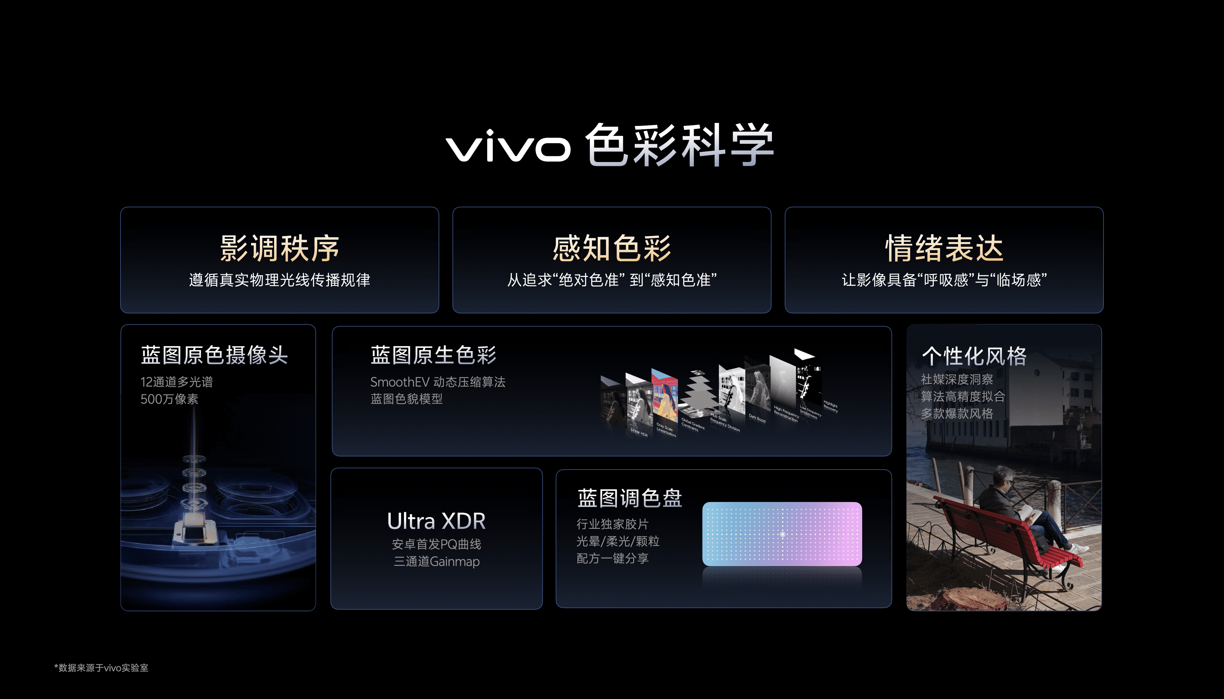 包括蓝图原色摄像头,蓝图原生色彩,Ultra XDR,个性化风格矩阵和蓝图调色盘,在感知色彩、影调秩序、情绪表达中做到了精准还原,确保精确的实现创作目的。