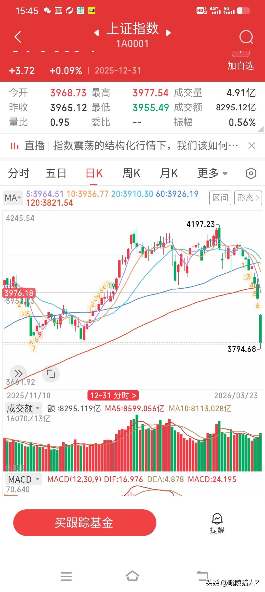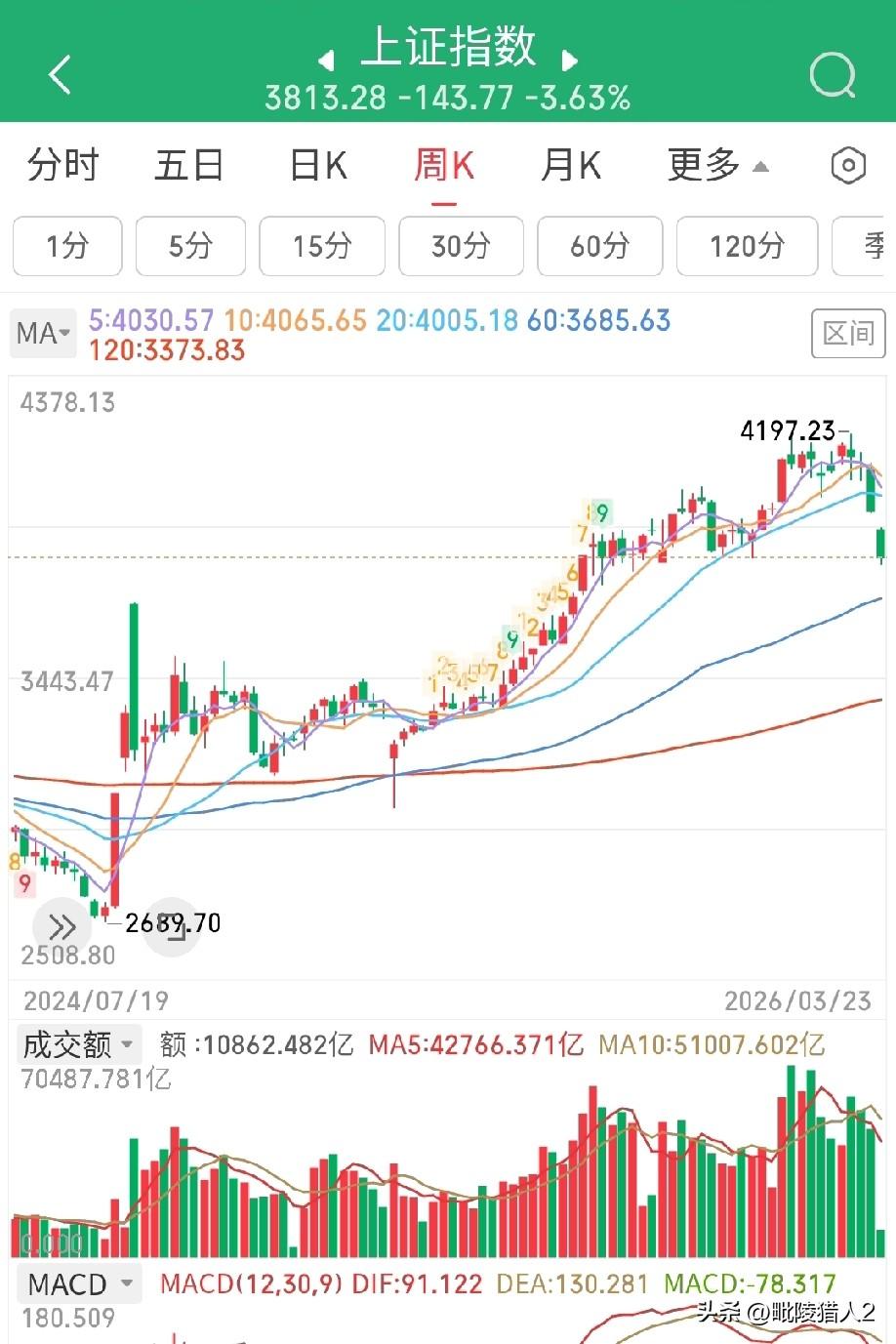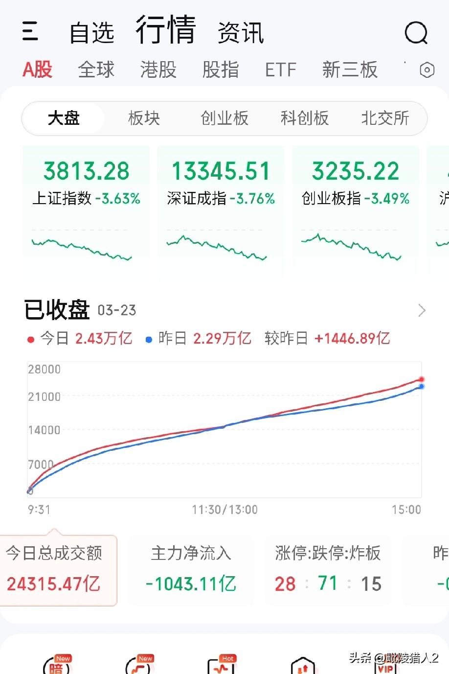 3月23日收评。 指数如瀑飞流, 散户神伤心揪, 漏槽破枥病牛。 夕阳西下,断肠人在灌酒。 今日A股,用一个惨烈来形容一点不为过,毗陵猎人还是在2016年的时候见到过这种情景。两市共有5172家个股下跌,其中71家跌停,仅305上涨,成交量放出1400亿,主力资金净流出1043亿(图1、2)。下午市场开始出现多杀多的踩踏恐慌盘。沪指最大波动幅度达到112点,一度跌破3800点。 大家一定要注意,今天的跳空低开已与去年12月31日的跳空高开相呼应,形成一个头部岛形反转形态(图3)。昨天的低点3955点,很可能是后期较长一段时间内的压力点位。 那么,明天指数会如何演绎呢?大概率是探底回升的反弹走势。早盘会承袭今日跌势继续下行,然后倚托3800点一线的支撑出现反弹,但是反弹的力度不会太大,因为市场一旦出现恐慌情绪,反弹时都会有大量套牢盘减仓离场,想反转很困难。市场当务之急是,要在一个强有力的支撑位形成钝化,先稳住指数,然后方能谈有效反攻。我们暂且先把3800点认为是强支撑位。一旦3800点被有效击穿,就要看到60周均线3700点的支撑位了(图4)。 板块上,中东战争导致的能源危机注定市场可能比较关注新能源和替代能源板块。事实上,今天市场除了煤碳、光伏板块好一点外,其它板块跌幅都很大。但是,毗陵猎人真诚相告,当下行情,还是多看少动为妙。 个人观点,不构成投资依据,不喜勿喷。祝大家明日好运。