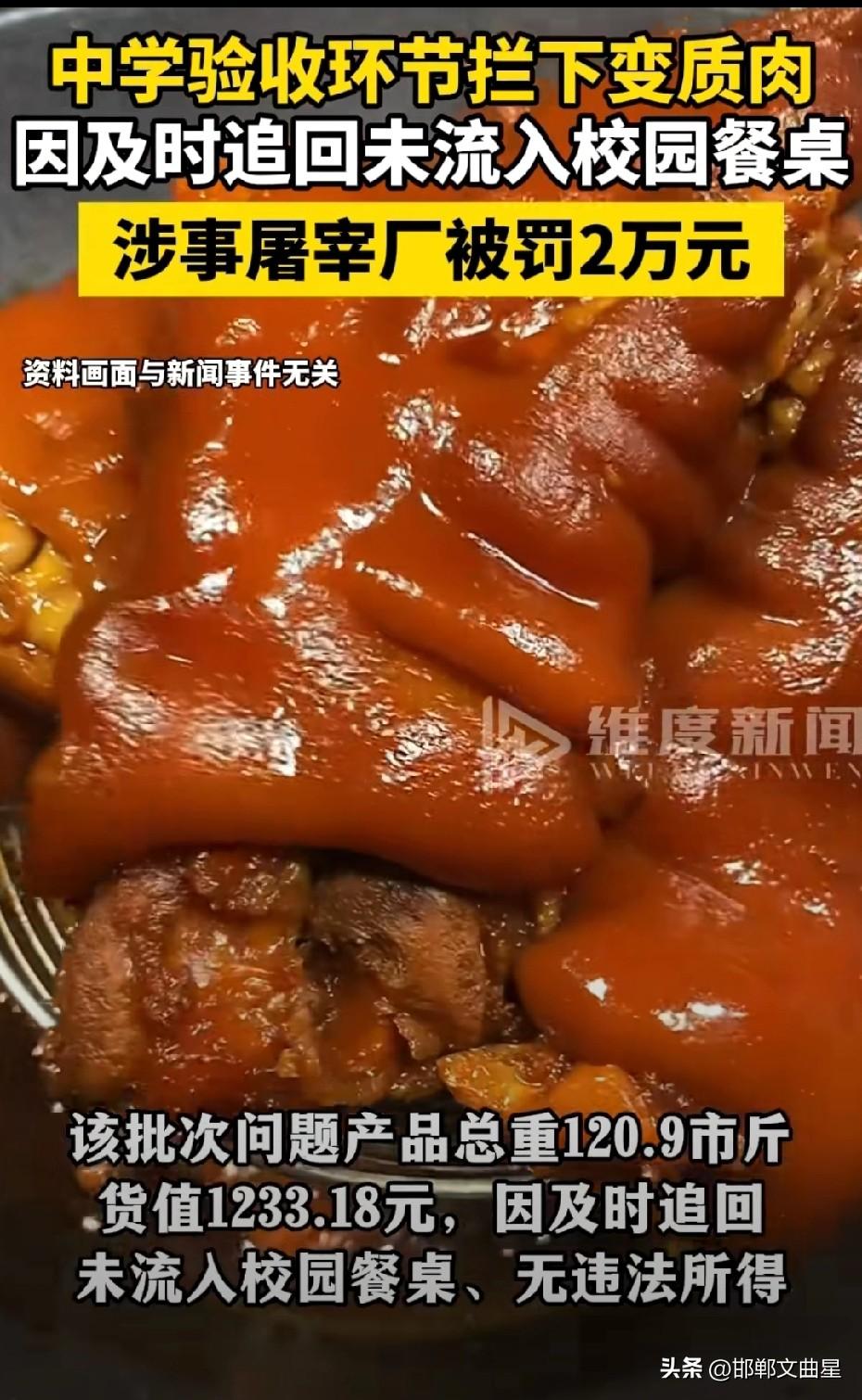罚2万就完事?中学拦下变质肉,更该严查的是配送链! 据媒体报道,近日,云南凤庆一所中学,在食材验收时果断拦下变质猪肉,避免了问题肉端上学生餐桌。事后,涉事屠宰厂被罚款2万元。 不得不说,这所学校的领导很负责任。但换个角度看,这件事细思极恐。 大家想一想,这两万块罚款,对黑心厂真的有震慑力吗? 一旦变质肉顺利流入学校,利润远不止这点钱。处罚太轻,很容易好了伤疤忘了疼,换个方式继续铤而走险。 这次能被学校拦下,是运气,不是常态。 这次靠学校认真把关才拦住,那如果学校验收松懈一点呢? 靠人自觉,不如靠制度严管。 其次,校园食材配送,背后的链条更该查 从屠宰、运输到配送,这么多环节,变质肉是怎么一路过关斩将送到校门口的? 是不是存在低价中标、以次充好、监管走过场? 不把根子堵住,今天拦了这批,明天还会有下一批。 我认为,守住孩子的餐桌,不能只靠学校“火眼金睛”。 轻罚不如重罚,抽查不如严查,事后补救不如全程监管。 校园食品安全,必须零容忍,罚到不敢犯,才是真的安全。 对此,大家怎么看?