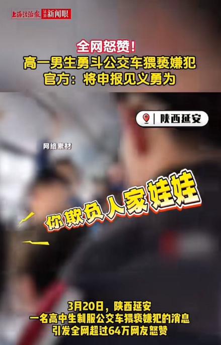“干得漂亮!”陕西延安,一高中男生坐公交,看到一醉汉正在猥亵一女初中生,女生骂醉汉,醉汉还打女生的嘴,男生挺身而出,把醉汉和女生隔开,让司机别开门放走醉汉,他先是打了110,后又联系了女生家长,不料,醉汉到站后想下车逃跑,男生把醉汉扑倒,当场制服。 车厢后半段挤得几乎转不开身,过道里站满了人,扶手都被攥得满满当当。 站着的乘客书包蹭着衣角,胳膊挨着胳膊,而坐着的乘客要么低头刷着短视频,要么戴着耳机闭目养神。 一个穿着校服、背着双肩包的女初中生,她一只手紧紧抓着扶手,时不时抬眼瞟一下窗外看到了哪里,安安静静等着到站下车。 当时的她,全然没留意到身旁那个浑身酒气的男人,正用不怀好意的眼神盯着她。 站在女孩身侧的中年男人,喝了不少酒,走路都打晃,浓重的酒精味隔着几步远都能闻见,说话舌头都捋不直。 他在拥挤的人群里蹭来蹭去,而他在晃到女孩身边后,竟胆大包天地做出了猥亵女孩的龌龊举动——摸了女孩的胸部。 毫无防备的女孩当场就僵在了原地,又怕又气。 但她最终还是咬着牙厉声呵斥对方,想让他住手。 可醉酒后的男人非但没有半点羞愧,反而抬手就狠狠扇向女孩的脸。 力道又重又狠,女孩被打得往后踉跄了一下,脸部瞬间发麻发疼,憋了许久的眼泪再也忍不住掉了下来。 周围的乘客被这动静惊动,不少人脸上露出愤怒的神色,可大多人心里都担心惹上没必要的麻烦。 一时间没人敢主动上前,车厢里瞬间安静下来,只剩下女孩压抑的哭声和男人含糊不清的骂声。 就在此时,不远处一个高中男生在听到女孩的呵斥和随后的声响后,立刻抬起头看过去,刚好撞见男人动手打女孩的一幕。 男孩立刻侧身挤过拥挤的人群,脚步飞快地冲到两人中间,稳稳地站定,将受惊的女孩护在自己身后。 他侧过头,压低声音轻声安抚身后的女孩,让她别害怕,往后退一退,离远一点,自己会守在这里,不会让男人再碰她一下。 在把两人隔开后,男生清楚当下最关键的是不能让作恶的男人跑掉,一旦跑了,后续很难找到人,女孩受的委屈也没法讨回公道。 他立刻朝着驾驶位的司机大喊,反复叮嘱司机千万不要开门,绝对不能放这个醉酒男人下车,把他牢牢困在车厢里,断了他逃跑的念想。 叮嘱完司机,男生马上掏出手机,冷静地拨通110报警电话。 电话接通后,他没有慌慌张张语无伦次,而是条理清晰地跟民警说明发生的事情,准确报出自己乘坐的公交线路、车辆当前行驶的路段和大致方位。 他还特意强调嫌疑人还在车上,已经让司机锁闭车门,请求民警尽快赶往就近站点接应。 挂了报警电话,男生转头看向身后依旧在发抖的女孩,想着她年纪小,独自遇到这种事肯定吓坏了,身边没有家人陪着,心里肯定又慌又无助,便轻声询问女孩家人的电话。 征得女孩同意后,男孩拨通了她家长的号码,语气温和地跟家长说明车上的情况,让家长不要过度着急,告知车辆即将到达的站点,说自己已经报警,会一直守在现场看着女孩。 在等待到达和警方约定的站牌时间里,男生寸步不离地守在女孩身边,眼睛一直盯着男人的一举一动。 周围的乘客看着男生义无反顾的样子,不少人开始主动靠过来,有的站在男生身边帮忙壮声势,有的轻声安慰受惊的女孩,有的则悄悄的录制证据画面。 醉酒男人见自己被团团围住,酒劲醒了一大半,心里开始发慌,脸上露出心虚的神色。 等到车辆缓缓驶入到了男孩和警方说的站点,司机刚操作开门,男人瞬间抓住这个机会,猛地推开身边的乘客,朝着车门冲了下去。 男生一直死死盯着男人的动向,见他突然冲刺逃跑,几乎是男人起身的瞬间,他就立刻迈开步子追了上去。 他快步冲到男人身前,将其稳稳扑倒在地上,随后还用自身的重量牢牢压住对方,不让他起身挣扎逃跑。 整个制服过程干净利落,男生没有使用过激的暴力,只是用最稳妥的方式限制住男人的行动。 周围乘客见状,也纷纷上前搭手,帮忙稳住现场。 没过多久,民警就火速赶到公交站点,第一时间控制住醉酒男人,而男生则从头到尾完整地跟民警讲述事情的经过。 车厢里的多名乘客也主动站出来,自愿为女孩作证,指证醉酒男人的违法事实,提供现场拍摄的证据,让民警快速掌握了完整的案件情况。 女孩的家长也匆匆赶到现场,看到女儿平安无事,得知全程都是这个陌生的高中男生一路守护、出手相助,家长心里满是感激,拉着男生的手不停道谢。 男生反倒有些不好意思,腼腆地摇着头,说这都是应该做的。 最终,警方依法对醉汉作出刑事拘留的决定,等待他的将是法律的严厉惩处。 而这位在危急时刻挺身而出、冷静处置的高中男生,他的勇敢善举和正义行为,得到了警方、学校以及周边群众的一致认可和高度赞扬,相关部门还为这名男生申请了见义勇为褒奖。 (信息来源:四川日报)
