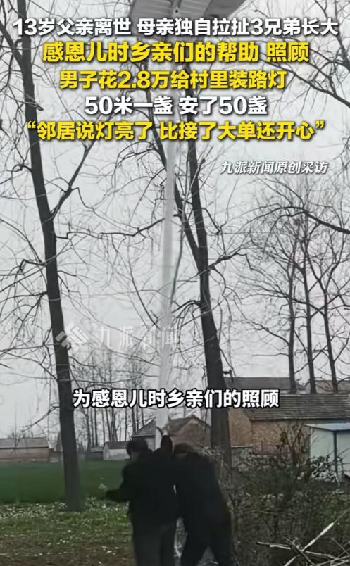 安徽宿州,男子13岁时,父亲离世,为感恩儿时乡亲们的照顾,花2.8万给村里装路灯。网友:“给村里带来了一片光明,这种知恩图报,让人泪目!” 往常的夜晚,村里早就陷入一片黑漆漆的寂静。 可如今,村子的每一条道路都亮堂堂的。 这一切全靠村里一位在外打拼的中年男子自掏腰包,给全村装上了崭新路灯。 而他不为博名声,不为求夸赞,只为偿还二十多年前,乡亲们在他家最难的时候,递过来的那一份份不图回报的温情。 在男子还年幼的时候,家家户户的日子都过得紧巴巴,全靠一年到头的农活维持生计。 父亲是家里唯一的收入来源,撑起全家的吃喝开销,母亲则在家操持家务、照顾三个孩子。 可在男子刚满13岁的时候,父亲连一句交代都没留下就骤然离世。 那时候,三个孩子正是长身体、要读书的年纪,学费、生活费、日常吃喝样样都离不开钱。 母亲只能靠着家里的几亩薄田苦苦支撑,白天顶着烈日下地干活,晚上回家还要做饭照顾孩子。 有时候实在撑不住,就躲在屋里偷偷抹眼泪,却从不在孩子面前表露脆弱。 村里的人都知道孤儿寡母的日子不好过,虽说他们自家日子也不宽裕,可没有一个人选择冷眼旁观,更没有一个人落井下石,反倒都主动伸出援手,用最朴实的方式帮衬着这一家人。 这家的大娘端来一碗刚蒸好的玉米面窝头,那家的大叔拎来半袋红薯和青菜,还有乡亲把自家省下来的细粮悄悄放在他家门口。 村里的妇女们还会轮流上门,帮着母亲收拾家务、照看年幼的孩子,有时候还会把自家孩子的旧衣服洗干净、补好送过来,冬天天冷,就把厚实的棉袄、棉鞋送过来,生怕孩子们冻着。 平日里的细碎帮扶,更是多到数不清。 他上学交不起书本费,村里的长辈悄悄塞钱,叮嘱他好好读书,不要操心家里。 放学回家路上,遇到的乡亲总会塞给他几颗糖或是一把吃食,或是几句暖心的安慰。 男子记着每一份来自乡邻的温暖,他也知道如若没有这些善意,母亲根本不可能独自把三个孩子抚养成人,他也不可能顺利完成学业,更没有机会走出村子去外面打拼。 这些年,他靠着吃苦耐劳的性子慢慢积累,有了稳定的收入,生活也慢慢安稳下来。 一天,他回老家探亲,发现早年装的几盏老式路灯早就坏了,一到晚上,村里就黑黑的。 思考片刻后,他没有跟村里提任何要求,也没有发动乡亲们凑钱,全程自己承担所有费用,从挑选路灯款式、规划安装位置,到联系施工人员、购置辅料,他全都亲力亲为。 前前后后连同施工、辅料等所有开销,总共花费2.8万元。 这笔钱对于他来说,并不是一笔小数目,是他辛辛苦苦攒下的积蓄,可他丝毫没有心疼。 因为在他看来,再多的钱,也买不来当年乡亲们的雪中送炭,这点付出,远远抵不上当年大家对他家的帮衬。 一段时间后,所有路灯第一次在夜晚全部亮起的时候。 原本漆黑的夜晚瞬间变得明亮通透,乡亲们看着一盏盏崭新的路灯,心里满是感激。 而在男子的心里,当年乡亲们在他家绝境时伸出援手,如今他条件好了,回馈乡邻也是理所应当,不过是做了自己该做的事,尽了一份该尽的心意。 这件善举,在网络上传播开来,网友们纷纷留言点赞。 有网友说:“当年的乡邻温情暖了一个家,如今的知恩图报亮了整个村。” 更有网友说:“当年的善意是因,如今的感恩是果。” (信息来源:九派新闻)