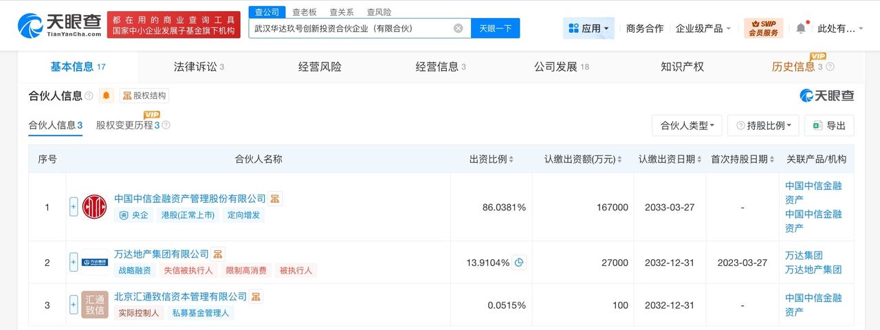 万达地产被冻结2.7亿股权 万达地产所持2.7亿股权被冻结 天眼查法律诉讼信息显示,近日,万达地产集团有限公司新增一则股权冻结信息,股权所在企业为武汉华达玖号创新投资合伙企业(有限合伙),冻结股权数额2.7亿元,冻结期限3年,执行法院为广东省广州市花都区人民法院。 武汉华达玖号创新投资合伙企业(有限合伙)成立于2023年3月,执行事务合伙人为华融资本管理有限公司,出资额19.41亿人民币,经营范围为以自有资金从事投资活动。合伙人信息显示,该合伙企业由中国中信金融资产管理股份有限公司、万达地产集团有限公司、北京汇通致信资本管理有限公司共同出资。 天眼查信息: