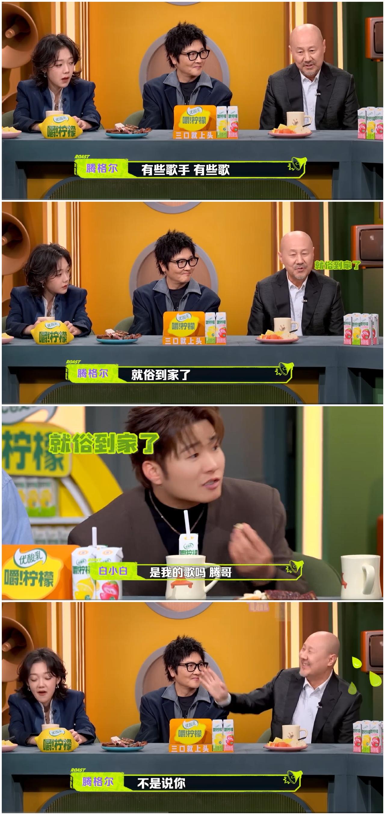 腾格尔这样说张韶涵, 就不怕张韶涵生气, 真太敢说了。 腾格尔强调张韶涵的《隐形的翅膀》简单, 在场嘉宾就不理解了, 质疑这个说法, 尤其是希林娜依高也觉得这歌不简单, 不同意腾格尔的看法。 眼看这个话题就容易成为第二天热搜了, 腾格尔坦言这首歌改编起来比较简单, 这下场上气氛才缓和下来。 就在众人以为结束, 放下心来时, 腾格尔又语出惊人了。 腾格尔强调当下还是需要像梁源那样的乐评人, 他坦言当下有些歌手,有些歌真的俗到家了。 白小白听到此话, 忍不住站起来, 以为是吐槽自己。 腾格尔马上解释不是特指白小白。 哎呀, 腾格尔也许真的觉得白小白的歌真的俗, 但是不敢当场指出, 这点体面还是要留给对方的。 在腾格尔旁边的孙楠则一声不吭, 还是腾格尔这样的老前辈比较敢说呀。