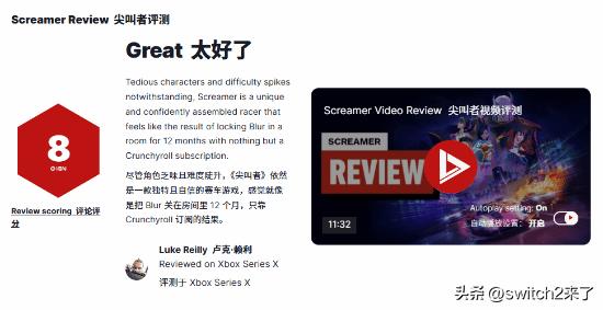 IGN为《Screamer》打出8分高分评价,测评者认为《Screamer》是一款融合了武器竞速与漂移驾驶的游戏,画面火爆、节奏激昂且充满动漫风格。这款游戏视觉效果惊艳,制作功底扎实,是一款极具挑战性的街机风格竞速游戏,且有着鲜明的自身特色。 IGN评分:8分 总评:《Screamer》拥有的精妙的双摇杆操控方案,以及需要灵活应对的、意外复杂的战斗系统,它成为了一款节奏紧凑、富有挑战性且玩起来很有满足感的竞速游戏。高速快感在最曲折的赛道上可能会大打折扣;部分车辆的驾驶手感比其他车辆更显拖沓;核心锦标赛模式的难度曲线存在明显失误;动漫化的角色画风也很让人感到乏味。 但在此之外,游戏中高度可自定义的快速赛模式,以及四人分屏功能,使其成为一款非常适合和身边朋友一起游玩的竞速佳作,值得常备。