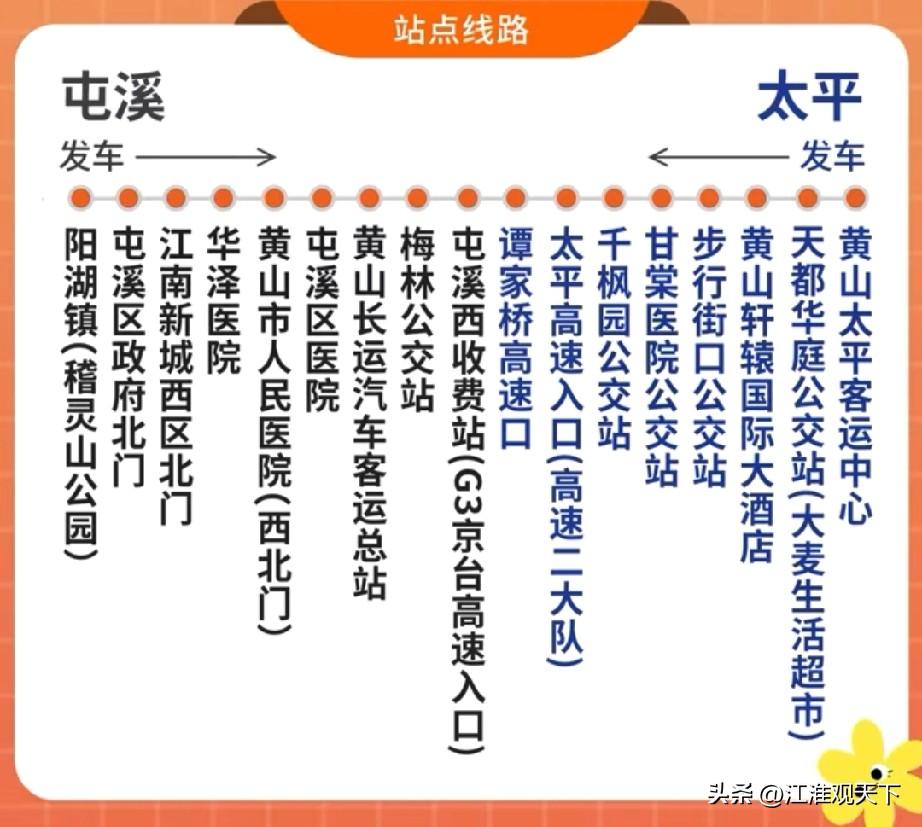 黄山市的屯溪到太平,26号站点巴士会开通运营,出行越来越方便了 提起黄山旅游,大名鼎鼎,闻名遐迩,因为其风景优美,黄山风景区更是我们国家首批5A级景区之一,含金量非常高。 提起黄山市,可说的事就太多了,毕竟安徽省名,就是取自于安庆府和徽州府的首字,只是徽州现在改名叫黄山市了。 皖美出行消息,3月26号,黄山市的屯溪至太平(屯溪区-黄山区),站点巴士正式会开通运营,首班车早上6点20分,末班车晚上5点35分,每天两地对开32个车次,提前一天购票只要14.9元。 黄山市的屯溪到太平有了站点巴士,市区内多站点可以上下车,方便大家交通出行,老百姓幸福指数会更加提升。黄山街景 屯溪区旅游 黄山东大门旅游 黄山屯溪镇 屯溪公交
