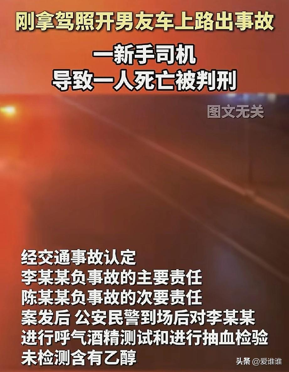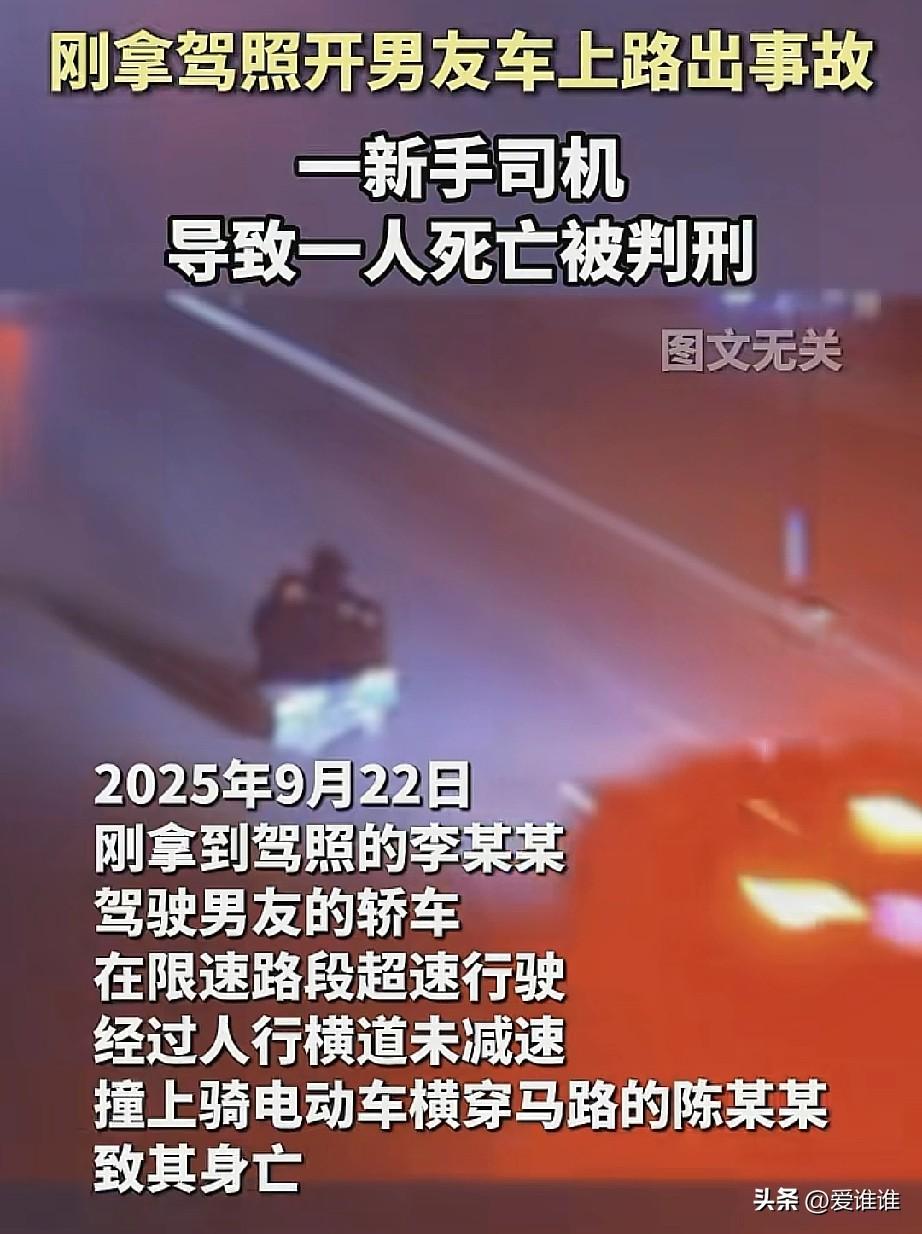 “太儿戏了!”海南,刚拿驾照的女主播,限速60路段飙到98迈撞死人,竟然只判缓刑,网友炸锅了! 刚刷到这条新闻,气得我手都在抖。 海口一个电商主播,刚拿到驾照,男朋友开着车接她,到了半路,男友说“你来开吧”,就把方向盘交给她了。 这一交,出大事了。 限速60的路段,这个新手司机油门一踩,直接飙到了98迈,近光灯没换远光,视线不好,人行横道也不减速,直接撞上了一个骑电动车的人。 当场死亡。 一个活生生的人,就这么没了。 更让人无语的是,事故发生时,男友就坐在副驾驶上,看着女朋友开98迈,连句“慢点”都没说,这不是纵容吗! 事后,家属赔了12万多,取得了死者家属的谅解,法院最后判了:过失致人死亡罪,有期徒刑一年,缓刑一年六个月。 判缓刑,意味着不用坐牢。 网上瞬间吵翻了。 有人说:“12万就买一条命?这也太便宜了吧!” 有人说:“刚拿驾照就敢开98,这不是开车,这是杀人!” 还有人直接怼那个男友:“你坐副驾驶是摆设吗?看着女朋友超速40码都不吭声,你是共犯!” 说实话,看到这个结果,我也挺不是滋味的。 我不是法官,但我知道一个道理:拿了驾照,握了方向盘,手里握的就是别人的命。 这女孩是幸运的,缓刑意味着她还有机会重新做人,可那个被撞死的人呢,他还有机会吗? 更讽刺的是,这姑娘还是个主播,有网友扒出来,北京之前也有个女主播,醉驾无证撞死两人,网红圈怎么老出这种马路杀手? 是钱来得太快,飘了,还是觉得出事也能摆平! 评论区有位老哥说得特别扎心:“限速60跑98,这不是技术问题,这是对生命毫无敬畏。不管你粉丝多少,在车祸面前,大家都一样脆弱。” 还有人说:“建议新手司机第一年强制限速,超速就自动报警,人命关天,不能拿侥幸当常态。” 我倒是觉得,法律是一方面,人心才是关键。 你开车时,有没有想过,一脚油门下去,可能毁掉的是两个家庭! 别等出了事,才哭着求原谅,那时候,说什么都晚了。 各位老铁,你们觉得这个判罚重了还是轻了?如果是你,刚拿驾照敢开98吗?评论区聊聊!