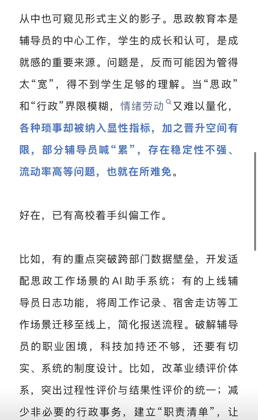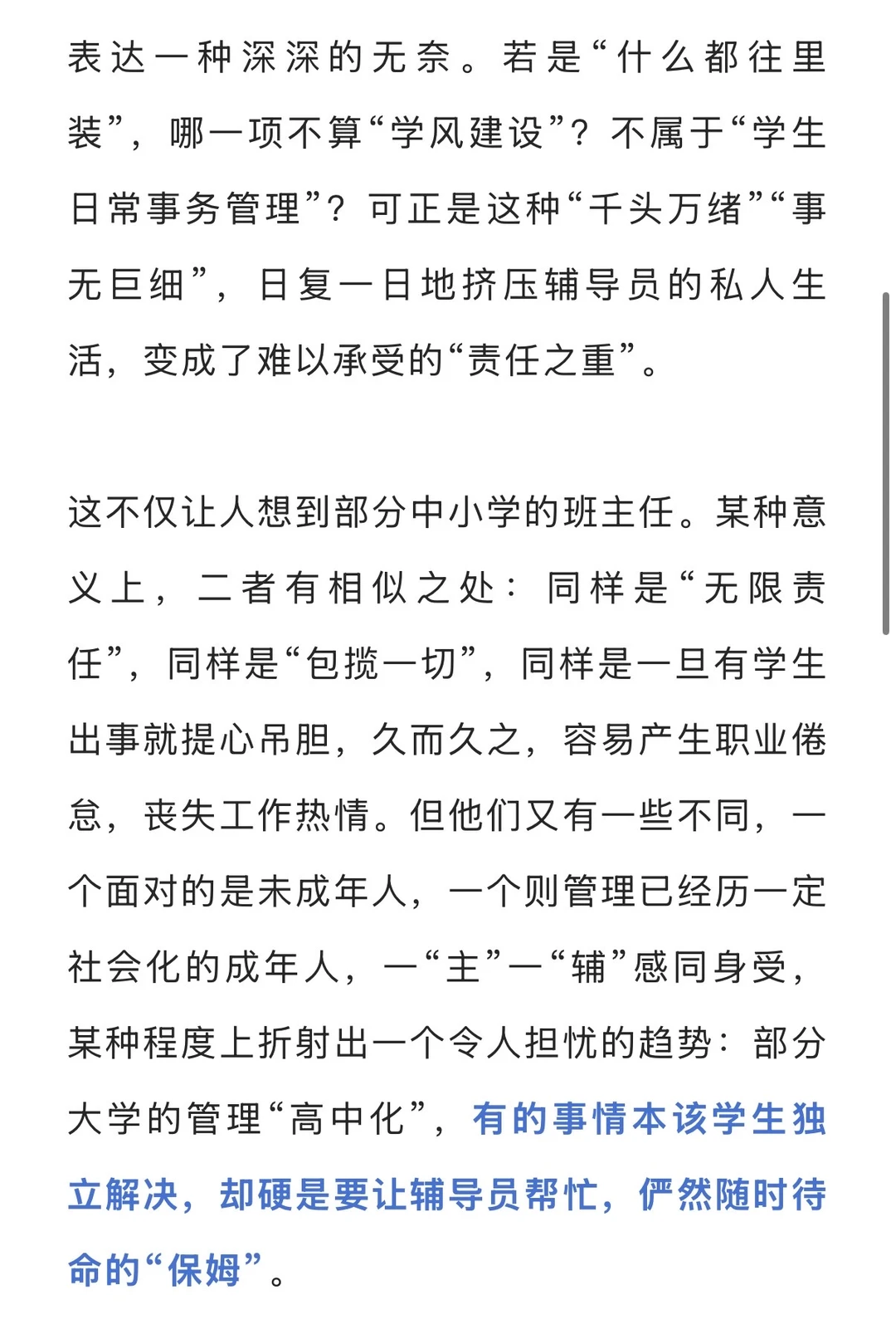 可要是问他们的职责范围,或许很多人并不能一下子答上来。“好像除了上专业课,什么都干。”请假审批要找辅导员,组织活动要找辅导员,数据统计要找辅导员,甚至连查寝、报销这类琐事也要找辅导员……作为连接学校和学生的桥梁,不少辅导员的职业边界持续扩张,“有事就找辅导员”成了一致动作。 辅导员,当然要以服务为本位。按照教育部发布的《普通高等学校辅导员队伍建设规定》,辅导员肩负思想理论教育和价值引领、学风建设、党团和班级建设等九大职责。一些辅导员自嘲为“服务员”,并非不愿意做事,而是在表达一种深深的无奈。若是“什么都往里装”,哪一项不算“学风建设”?不属于“学生日常事务管理”?可正是这种“千头万绪”“事无巨细”,日复一日地挤压辅导员的私人生活,变成了难以承受的“责任之重”。 这不仅让人想到部分中小学的班主任。某种意义上,二者有相似之处:同样是“无限责任”,同样是“包揽一切”,同样是一旦有学生出事就提心吊胆,久而久之,容易产生职业倦怠,丧失工作热情。但他们又有一些不同,一个面对的是未成年人,一个则管理已经历一定社会化的成年人,一“主”一“辅”感同身受,某种程度上折射出一个令人担忧的趋势:部分大学的管理“高中化”,有的事情本该学生独立解决,却硬是要让辅导员帮忙,俨然随时待命的“保姆”。