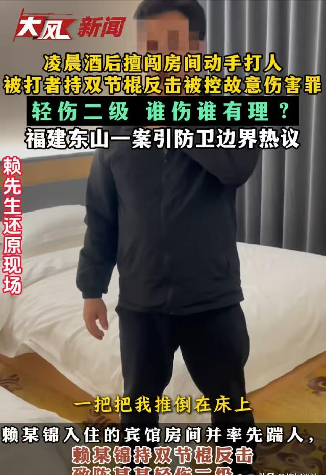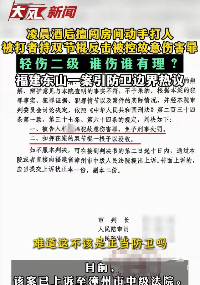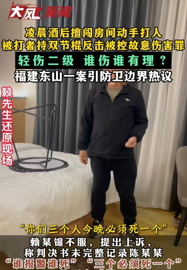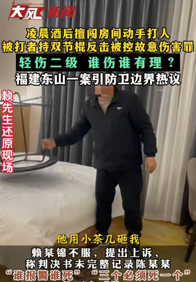福建东山,赖某和员工出差住酒店,半夜2点左右,曾经的合伙人陈某突然闯进房间一脚把他踹翻,赖某从包里拿出双截棍反击,陈某受了伤。让人没想到的是,陈某仅仅被拘留了4天,赖某却因故意伤害罪被关了8个月。赖某不服,认为自己是正当防卫! 两份诊断书,让所有人都沉默了。 一份写着:赖某,全身软组织挫伤,未达轻微伤标准。 另一份写着:陈某,多处骨折,轻伤二级。 然后法院说,赖某有罪。 2024年7月2日凌晨1点50分,福建东山某宾馆,这个案子的全部荒诞,都压缩在那扇被踹开的门后面。 赖某当时163cm,睡前刚吃了宵夜,穿着内裤坐在床沿。房间里还有他弟弟和员工。三个人都是瘦小的广东体型,没有任何准备。 陈某180多cm,喝了酒,是赖某以前的生意合伙人。两人散伙的导火索是账目——陈某在合伙期间吃回扣,赖某私下警告过他,他不但没收手,反而变本加厉,最终大家一拍两散。 打那以后,陈某开始记账了。 2024年6月30日,他在群里公开骂赖某,牵连了赖某的家人,放出狠话要让他们好看。在此之前,他曾多次阻拦赖某运送海鲜的车辆通行,刻意干扰对方正常经营,影响其生计与日常生意运转。赖某第一时间去报警,警察记录在案,但什么都没能阻止。 两天后,陈某在附近喝酒,朋友随口说了一句赖某就在这家宾馆。 他放下酒杯,直接过去了。 员工刚把门拉开一条缝,陈某就整个人撞进来,冲着赖某骂:"还敢报警搞我?"话没说完,人已经扑上去,把赖某死死按倒在床上。 赖某当时还在劝:"哥,有话好好说。" 陈某的回应是一脚踹在他腹部,赖某当场翻滚到床边,吐出血来。 弟弟和员工上去拉,根本拉不住。陈某顺手抓起小茶几就砸,赖某侧身躲过,摸到了随身包里的木质双截棍——平时练手用的那种。 他举起来,想逼陈某退后。 反击发生了。陈某喝了酒,反应迟了半拍,被打中了几处,退进卫生间,把门锁上。 就在那个喘息的间隙,员工拨出了报警电话。 陈某在里面听到报警声,开始狂嚎:"今晚你们仨谁也别想活,必须死一个,谁报警谁先死!" 吼完,他又冲出来。 三个人合力,把他按在地上,直到警察到场。 警察带走陈某的时候,赖某还在地上,浑身是血,被送去急救。 然后是鉴定结果,然后是那两份诊断书,然后是2024年8月14日—— 警察来带走了赖某。 不是陈某。是赖某。 后续八个月里,赖某一直被羁押于看守所。陈某仅受到行政拘留处罚,期限为四天,期满后便予以释放。 一审法院的逻辑并不复杂:陈某没有拿刀,没有枪,属于徒手伤害。赖某持械反击,造成轻伤二级,打重了,所以是故意伤害罪成立。虽然最后"免除刑罚",但罪名落下来了,就是落下来了。 赖某拿到那张判决书的时候,双手在抖。 他说,卷宗里那句"今晚必须死一个",关键笔录压根没记清楚。 那是陈某当着三个人的面喊出来的话,是这整件事里最重要的一句话,但它在司法程序里消失了。 失去了这句话,就失去了恐惧的合理性。失去了恐惧的合理性,"必要限度"这四个字就压死了赖某。 法律对正当防卫有要求,防卫行为必须与侵害手段相当。没问题,这是基本逻辑。但"相当"这个标准,是在事后复盘的办公室里丈量的,还是放在那个凌晨两点、肾上腺素爆表、对方还在咆哮"要死一个"的现场来衡量的? 一个163cm的瘦子,面对180cm的醉汉,被踹得吐血,在被死亡威胁的两分钟里,你要他精准控制每一下的力道。 这个要求,是说给人听的吗? 更荒诞的是结果的对称性——闯门的人、踹人的人、砸茶几的人、喊着"必须死一个"的人,拘留四天,出去了。报警的人、挨打的人、吐血的人、用工具撑住自己活下来的人,刑事羁押八个月,背着案底。 你很难不去想,这个结构对下一个陈某意味着什么。 打赢了是罪犯,打输了才叫守法。这句话是赖某说的,但说出来之后,很多人突然觉得这不是他一个人的问题。 门锁、电话、报警——这些"正确的处置方式"赖某全做了,结果他还是在看守所待了八个月。 那普通人在家里面对踹门进来的陌生人,手边恰好有件东西,那一刻敢不敢用? 赖某现在在等二审。 他说,不是为了争一口气,是因为这个答案太重要了,不能没有。 参考信息:法治视讯.(2026-03-18).酒后擅闯房间动手打人,被打者反击致闯入者轻伤二级被控故意伤害罪。谁伤谁有理?福建省东山县一案件引防卫边界争议。