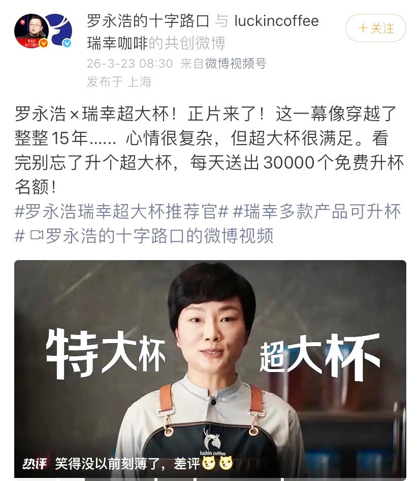 罗永浩这波玩梗太绝了!时隔15年把星巴克中杯名场面的女主请回瑞幸,直接把互联网老梗玩出了新高度,这波回忆杀谁的DNA动了! 谁能想到当年把老罗逼到自扇耳光的“狠人”,如今成了瑞幸广告里的老熟人,那句“罗老师别这样”一出来,满屏都是爷青回的快乐。老罗这些年从不缺打脸名场面,创业翻车、直播带货、跨界互怼,可他最牛的从不是赢过谁,而是敢把自己的“名场面”变成玩梗素材,把尴尬活成笑点。 别人的黑历史藏着掖着,老罗偏把过往的“打脸”变成流量密码,这份敢自嘲、会玩梗的通透,才是他一直被记住的关键。毕竟能笑着面对自己的过往,比硬刚到底更显智慧。 你觉得老罗这波玩梗是不是教科书级别的营销?还有哪些老罗的经典名场面让你印象深刻?