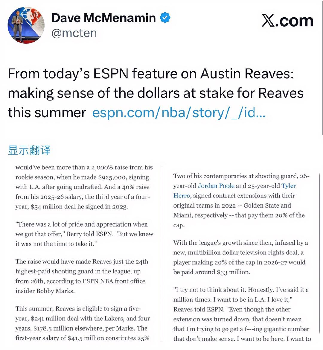 里夫斯休赛期问题非续约而是湖人建队思路! 湖人最近战绩那是如日中天,小里的个人数据也来到了场均23.5分4.8板5.5助攻1.1抢断,三项命中率分别为49.4%36.3%86.6%,本赛季30+的场数等多项数据创生涯新高,即便命中率较过往略低产量也是提升的,可以说就数据而言妥妥的二当家级别,另外他本赛季带队能力提升有目共睹!这不稍早前媒体就报道湖人休赛期可能给他5000万大合同,再次引起不小争议;首先我们要明确一点,小里续约是板上钉钉的事,不管从场内还是场外考虑,加上他本赛季的表现,都值得一份大合同,且小里占用的帽下空间是有限的,高薪留队带来的后果无外乎两点,一是性价比,二是更高的奢侈税,相信这都不会对新老板构成障碍,问题的本质还是建队思路,继续以东、里共筑争冠后场,还是在获得第二球星的情况下被送走(有两种可能,成为大交易筹码之一或裸签第二球星后被整钱换零),相信这才是管理层需要考量的核心内容! 我倾向于小里留队可能性更大,他的争议问题有三点,防守无法与东契奇互补是被对手点名的常客、打高强度对抗局时乏力、三核的兼容性;如果就本赛季的小里来看,这样的论调正在被缩小: 1.虽说防守端他补不上东子的漏,但其防守表现相较以往已有所改善,身形也大了一圈,组织和进攻上的开发更是有大跨度飞跃,特别末节得分7.8排全队之首,单就这几项功能而言,不仅可以为东契奇分忧还让战术选择更加丰富,正向收益显而易见。 2.小里本赛季打硬仗的能力继续加强,他在单核和双核带队时都非常出色,可以独自吸引包夹,多次单核带领球队获胜还有绝杀表现,天赋的短板的确带来限制,但球商会继续帮助他提高在这方面的水平。 3.前几场老詹休息小里场均30+,近几场老詹复出后有所下滑,这并不是兼容性的问题,球权就这么多三核肯定需要有所牺牲,还得让一部分出手给内线和替补,而东詹状态正火,小里把体力投入到防守中,命中率出现起伏很正常,没必要过度解读。 最后不得不说的是场外小里与东契奇已建立了深厚的友谊,而且他还是湖人“亲生仔”,管理层一直很喜欢他;考虑到老詹的退役时间点临近,小里的作用已变得越来越不可忽视,我相信小里作为本地人与球队的感情,他并不会索要一份顶薪合同,甚至以离队作筹码,双方会在续约谈判中保持默契!未来看好这对二人组共同带领球队前进!