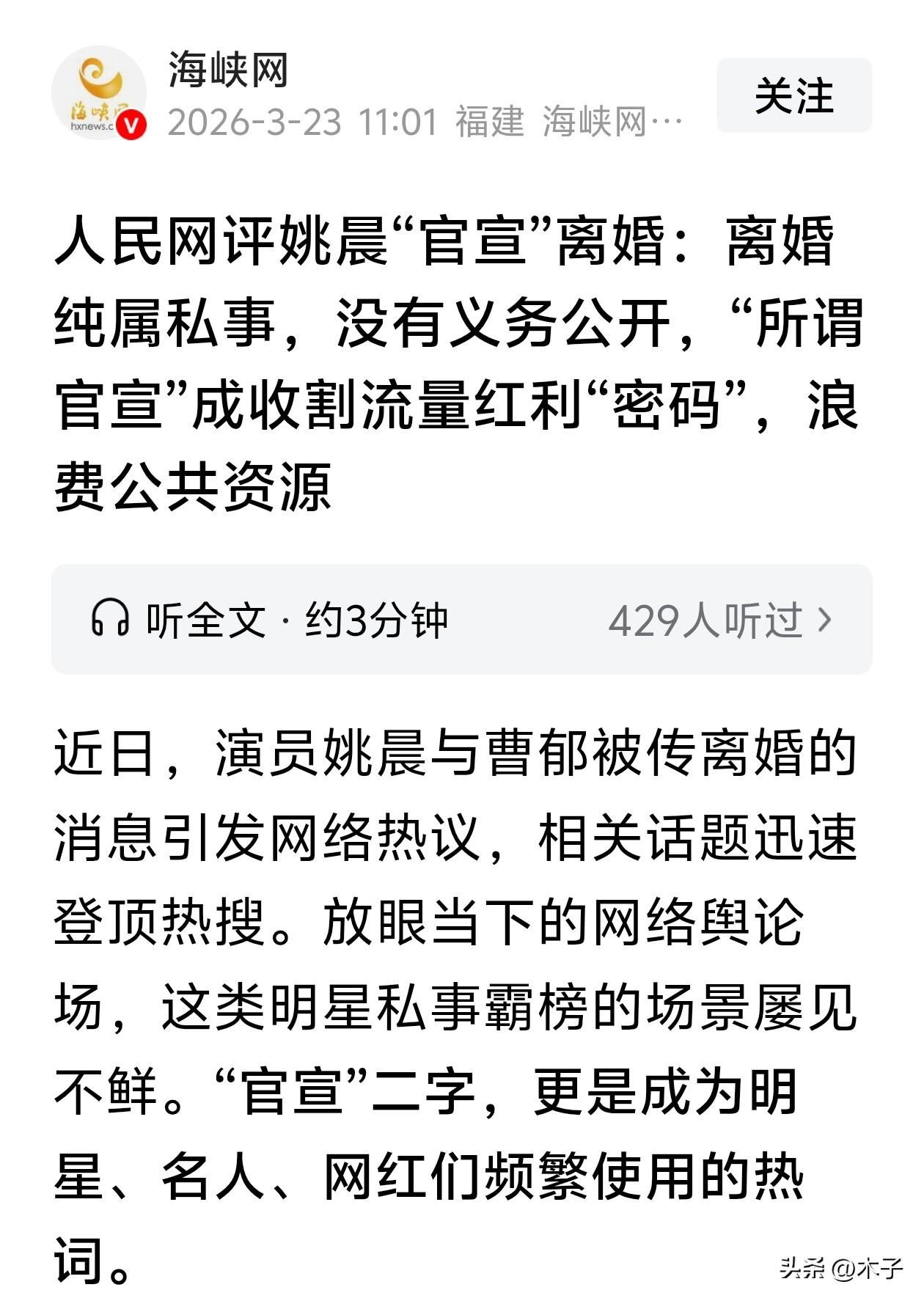 大快人心,这次真是说到点子上了,人民网下场锐评明星私事官宣乱象,句句都戳中了观众憋了很久的心声! 3月23日,人民网发布《三评“所谓官宣”之一:自爆私事,何来“无意”!》的评论文章,直接撕开了明星把私生活当流量生意的遮羞布 。 文章直指,如今被明星玩烂的“官宣”,本质上是人为建构、专为传播围观而制造的“伪事件”,根本不是自然发生的社会事实,而是披着真实外衣、专供消费的舆论产品 。 要知道,“官宣”原本是党政机关、国家部门发布重要政务信息的专属公文用语,自带严肃权威的属性。 可现在,明星恋爱分手要官宣,结婚离婚要官宣,甚至染个头发、养的猫生崽,都要打着“官宣”的旗号霸占热搜,硬生生把庄重的公共话语,变成了收割流量的“密码”。 更讽刺的是,每次这类私事官宣被质疑占用公共资源时,明星团队的回应永远是同一套说辞:“只是分享个人生活,无意占用公共资源”。 而人民网直接戳穿了这套话术的虚伪——主动把私事推上公共舆论场,引发热搜霸榜、全网围观,本身就是对公共资源的浪费,和“无意”根本没有半点关系。 公共注意力本就是稀缺资源,当明星的家长里短、爱恨情仇反复霸占热搜位,那些真正关乎民生的政策解读、需要全民警惕的安全预警、有现实价值的公共议题,只会被挤出公众视野 。 评论也明确点出,离婚这类私事,根本不属于公众知情权的范畴,明星完全没有义务向全社会公开,更不该借用“官宣”这类权威词汇。 观众从来不是反对明星分享生活,是反对把分享变成炒作,把私事变成生意。 一个演员,真正值得“官宣”的,是你打磨了很久的新作品,是你身体力行的公益项目,是能给年轻人带来正向引导的事,而不是把自己的私生活,变成全民围观的狗血肥皂剧。 把私生活还给自己,把作品留给观众,让“官宣”回归本意,这才是公众人物最该有的清醒。 人民网三评所谓官宣 内娱官宣乱象