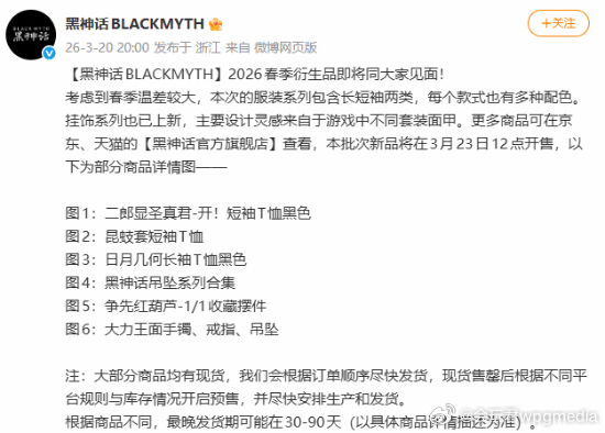 《黑神话》官方上新春季新品《黑神话》官方微博官宣2026春季衍生品上线,涵盖服装、挂饰、收藏摆件等品类,新品3月23日12时开售。结合春季温差,本次推出长短袖服装系列,各款式有多色可选,包含二郎显圣真君、昆蚑套短袖及日月几何长袖T恤,融合IP元素且兼顾舒适性。挂饰及收藏类同步上新:挂饰以游戏套装面甲为灵感,含吊坠、手镯等单品;收藏类重点推出争先红葫芦1/1摆件(大尺寸,售价1998元),另有吊坠合集可选。新品将在京东、天猫黑神话官方旗舰店上架,3月23日12时开售,大部分商品有现货,将按订单顺序发货。官方提示,现货售罄后开启预售,因品类不同,最晚发货期30-90天,具体以商品详情为准。《黑神话》此前衍生品广受好评,本次新品延续IP核心,优化设计,丰富了衍生品矩阵,助力IP传播。