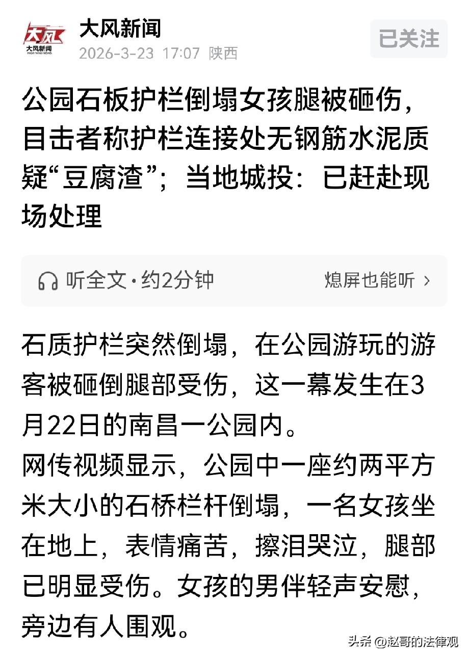 豆腐渣工程?江西南昌,一女孩在公园游玩,刚走上一座小桥,突然桥上的石板护栏倒塌,正砸中女孩的腿。女孩疼的大哭,有游客看到跑过来,和女孩同伴想抬起石板救人,不料石板重量惊人,两拼命才将将抬起,女孩的脚受伤不轻。事后,拍视频的游客发现,那么重的石板没有一根钢筋,竟然是粘上去的,认为是豆腐渣工程。 发布视频的游客,在评论区表示:当时他也在公园游玩。 就在一瞬间,听到女孩的惨叫。 他赶过去就发现,女孩的脚被压在一块大石板下。 那块石板,正是小桥上的石护栏。 他赶紧过去帮忙,有人和女孩的同伴费了好大的劲,女孩的脚才抽出。 女孩坐在地上,腿根本不敢动,疼的直哭。 随后,他们是先拨打了120然后再打了110。 直到120来了,把受伤女孩接走,这位好心的游客才离开。 可好好的石板护栏,怎么说倒就倒? 公园的那座石桥不大,也就两平方米左右,平时不少人喜欢站在桥边拍照。 女孩男同伴来公园散步,两人走到桥边,女孩刚停下想在桥上看风景。 根本没碰到石板护栏,可它就这么直直地砸了下来,正好砸在女孩的腿上。 女孩疼得“啊”地叫出声,眼泪瞬间就下来了。 同伴慌了神,赶紧蹲下来查看情况,只见女孩的腿被石板压着,血慢慢渗出来,染红了裤腿。 离得近的几个游客,听到动静赶紧围了过来。 他们帮忙抬石板,可那石板死沉死沉的,两个人使足了劲,脸都憋红了,才勉强把石板挪开一点。 有人帮着女孩,给她把腿抽出来。 视频拍摄者当时也在公园里,听到动静赶过来,正好看到这一幕。 他赶紧掏出手机拍视频,边拍边说:“这护栏怎么说倒就倒,太吓人了!” 视频里,女孩坐在地上,脸色苍白,疼的浑身发抖,眼泪流了满脸。 同伴在一旁轻声安慰,手忙脚乱地找纸巾给女孩止血。 拍摄者说,那石板看着挺厚的,两个人抬都费劲,更别说砸在人腿上了。 她看着女孩受伤的样子,心里又气又急,忍不住在视频里感慨:“这不是豆腐渣工程吗,害死人了!” 有人上前查看,这才发现,倒塌的石板,和旁边还没倒的护栏连接处,根本看不到钢筋水泥。 却发现好像用胶水粘上去的一样。 视频发布后,网友们纷纷留言:护栏里连根钢筋都没有,不是豆腐渣工程是什么? 搭积木呢,一根钢筋都不放,怪不得没人碰都能倒。 受伤女孩被送到医院后,医生检查发现她腿部骨折,需要住院治疗。 女孩的家人赶到医院,看到女儿躺在病床上,疼得直哭,又心疼又生气。 他们想不明白,公园里的护栏怎么说倒就倒,这责任到底该谁来负? 出事后,有记者联系了工程责任方。 工作人员说,事发后公司总部和下属项目负责人都赶到了现场。 他们先安排了伤者的救治,还对护栏进行了加固,防止再发生类似的事情。 对于网友质疑的,小石桥是豆腐渣工程。 工作人员解释说,应该不是偷工减料,可能是护栏的个别支撑支护出了问题,才导致倒塌。 公司负责人,已经带着专家到现场查看分析原因了,等结果出来会给大家一个说法。 可这样的解释,网友们并不买账。 有人说:就算不是偷工减料,那护栏的安装质量,也太差了,小风一吹就倒了? 还有人说:最保险的就是,请第三方机构来调查鉴定才为准。 受伤女孩的家人也表示,他们不会轻易接受这样的解释,一定要讨个说法。 他们说,女孩本来好好的,就因为这护栏倒塌,受了这么重的伤。 就怕以后走路受影响,这责任不能就这么算。 这次护栏倒塌,让人们对公园的安全产生了担忧。 如果连护栏都这么不结实,那其他设施,是不是也存在隐患? 以后还敢放心地去公园玩吗? 民法典第一千二百五十二条:建筑物、构筑物或者其他设施倒塌、塌陷造成他人损害的,由建设单位与施工单位承担连带责任。 但是建设单位与施工单位能够证明不存在质量缺陷的除外。 建设单位、施工单位赔偿后,有其他责任人的,有权向其他责任人追偿。 因所有人、管理人、使用人或者第三人的原因,建筑物、构筑物或者其他设施倒塌、塌陷造成他人损害的,由所有人、管理人、使用人或者第三人承担侵权责任。 如果经调查,是施工质量问题,存在未按规范设置钢筋等偷工减料行为。 或安装不符合标准,那么建设单位,和施工单位需承担连带责任。 也就是说,女孩可向建设单位,或施工单位中的任何一方,要求其承担赔偿责任。 赔偿包括,医疗费、误工费等。 若后续查明,是公园管理方,未及时维护保养,等原因导致护栏倒塌。 这事应由公园管理方,承担侵权责任。 你觉得,石护栏倒塌是谁的责任呢?