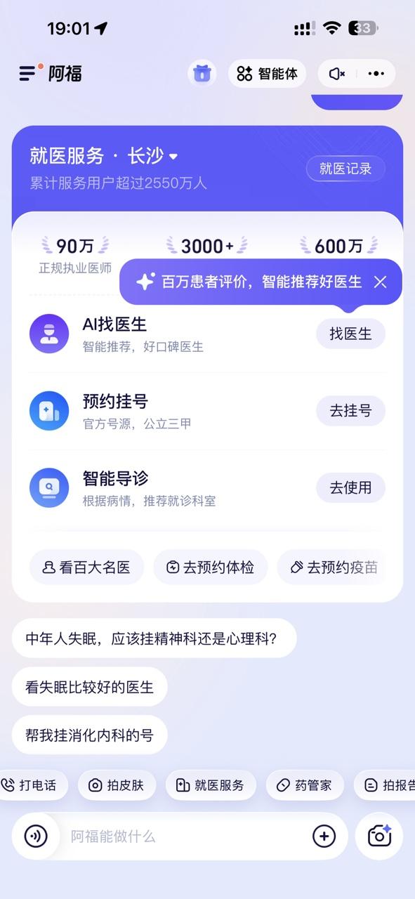 想象一下,你是不是有时也不知该如何描述健康问题?而阿福的一大亮点是支持拍照识别功能,无论是皮肤状况、体检报告还是药盒说明,拍张照片它就能快速提取关键信息、答疑。另外阿福还整合了医保码、挂号、线上问诊等一系列服务,不只告诉你“该怎么做”,还能帮你完成下一步操作,帮父母建立电子健康档案后,阿福还能提供更精准的建议。