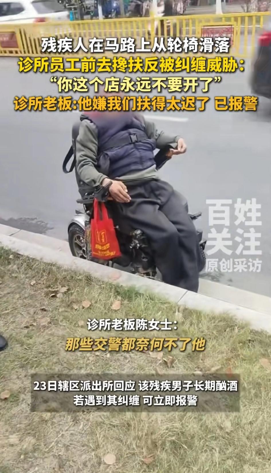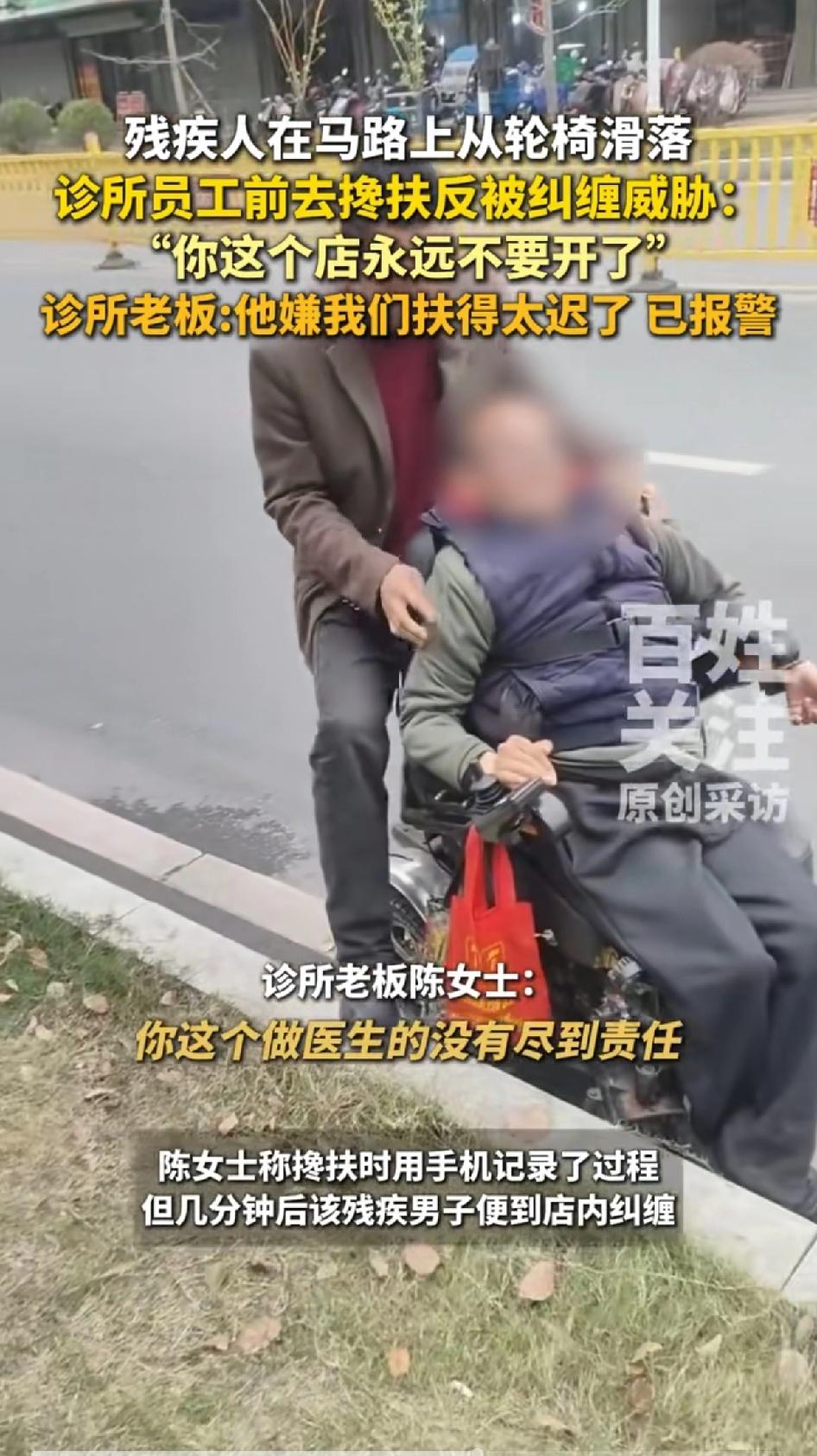 残疾人在马路上从轮椅滑落,诊所员工前去搀扶反被威胁:“你这个店永远也不要开了”,