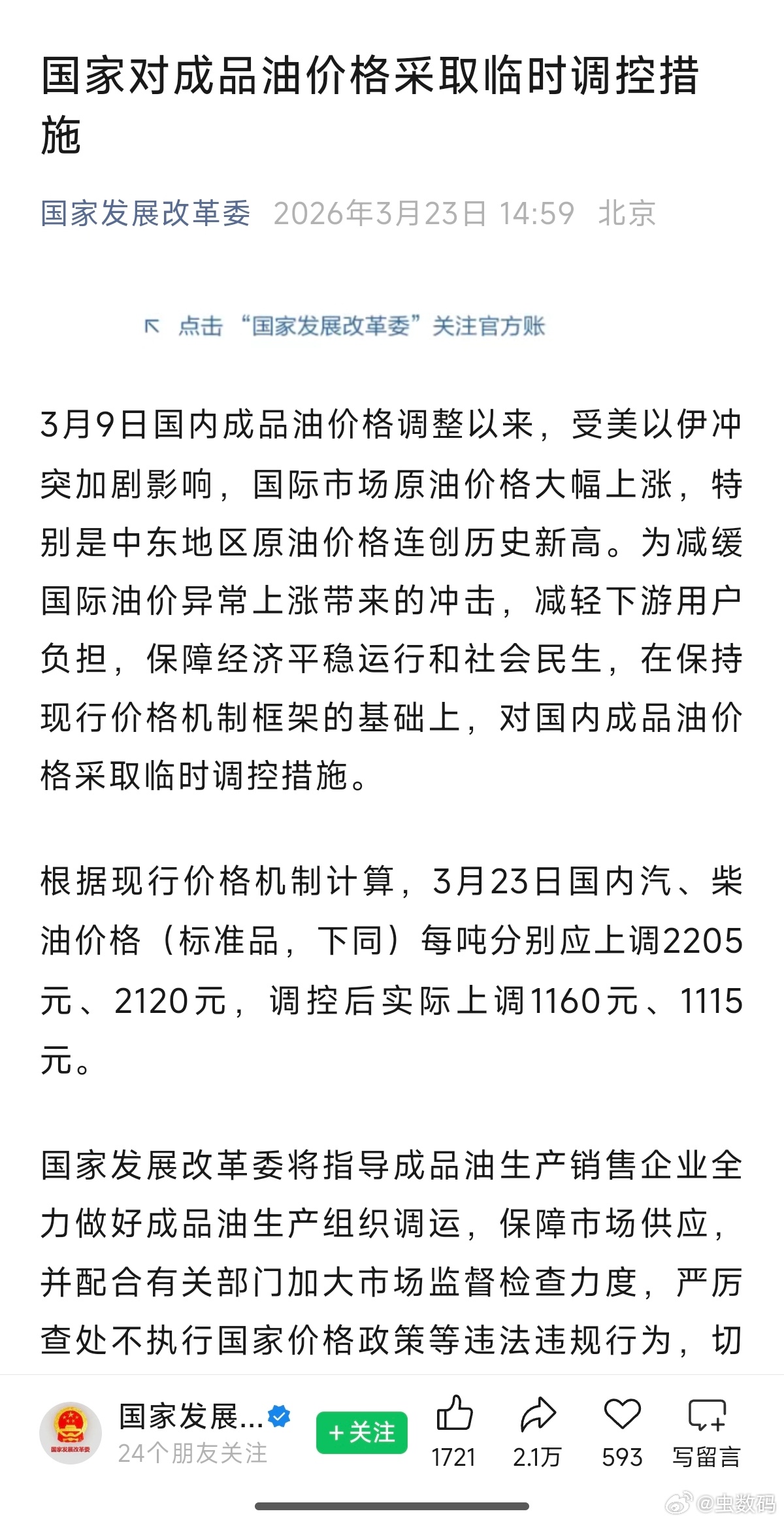 对国内成品油价格采取临时调控 该来的还是来的,成品油调价窗口再次开启。这次够夸张的,柴油和汽油每吨本来分别应上调2205元、2120元,国家出手调控后实际上调1160元、1115元。本来每升汽油差不多要涨 1.72 元,现在每升少涨了 0.85 元,对油车党,来说是不幸中的万幸。