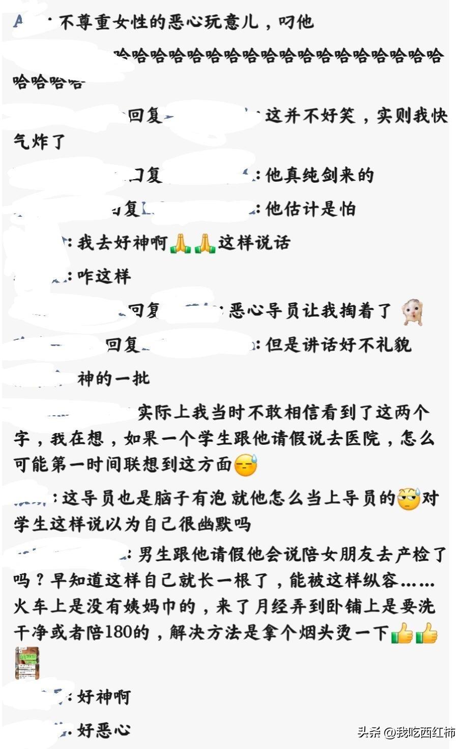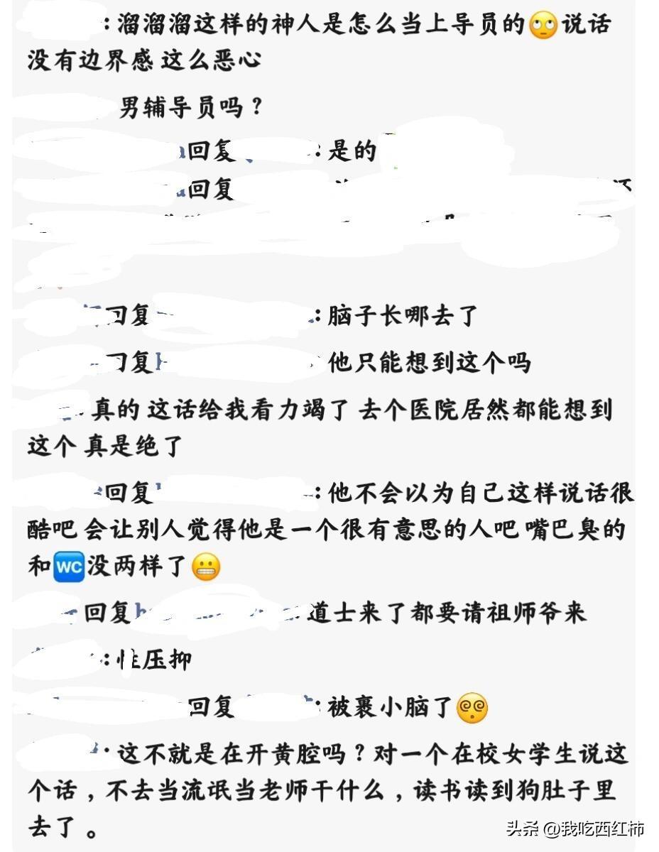 为人师表这样说话这不合适吧 周日是要开班会的,因为我是有男朋友的,导员也知道,今天班会请个假说去医院,他第一时间联想到是有了…… 实际上我当时不敢相信看到了这两个字,我在想,如果是一个正常思维的老师,学生跟他请假说去医院,怎么可能第一时间联想到这方面?男生跟他请假他会说陪女朋友去产检了吗? 此条朋友圈也是让许久不联系的高中女同学和大学女同学盖了高高的楼,本来一开始以为是我背着重的背包撑着伞在雨中有了半个小时,心里很敏感,后面发了朋友圈后发现这真的是在校女大学生来说非常冒犯了…实际上对每个女孩子来说都是非常冒犯的行为