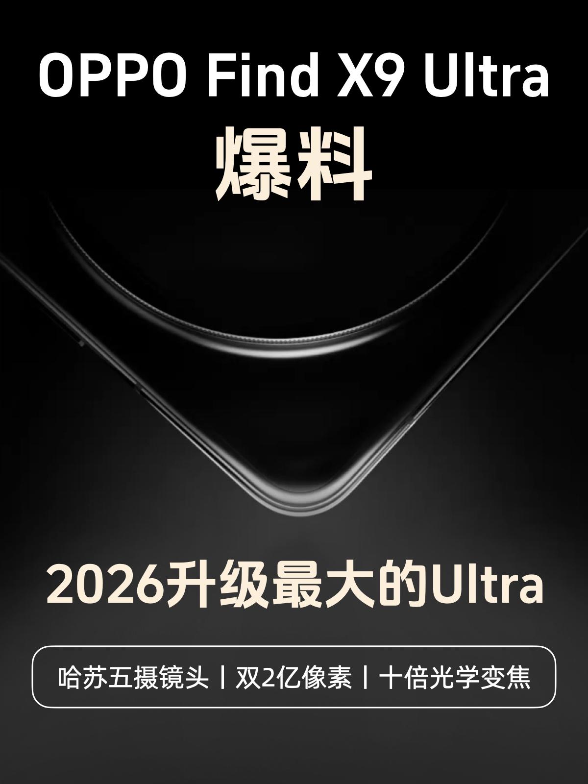 OPPO Find X9 Ultra爆料汇总😱我直接好家伙 2026上半年新机扎堆亮相,爆料是一台接着一台 很突然嗷 ,OPPO Find X9 Ultra就这么上线预约了,整理了下已经爆料的配置,我盯着相机参数看了半天...... 怎么说呢,就是离谱中带着合理,合理中又带着离谱😂 先说重点👉影像系统,X9U主打就是一个「口袋哈苏+手持哈勃」 📸 2亿像素主摄+2亿像素3X潜望长焦+10X潜望长焦+5000万像素超广角+新一代丹霞色彩还原镜头 哈苏双2亿双潜望,10X潜望还是现在很少见的,还有色彩镜头,你说这镜头堆料它合理吗?拆开来给两手机用都够了吧?难怪还有人说是“哈苏X9D” 顺便看下其他配置也很能打👇 ⭕6.8寸2K直屏 ⭕7000+mAh + 100W快充 + 50W无线 ⭕骁龙8 Elite Gen 5 ⭕IP68/69防水 + 3D超声波指纹 感觉这代Find X9 Ultra应该是近期升级zui大的一款Ultra旗舰了吧? 网上都在说最近手机涨价,要买肯定是买升级幅度大的,尤其是超大杯这种一买用好多年的,买X9U好像会更值的,口袋哈苏用几年,你们觉得咋样? OPPOFindX9Ultra 拍照手机 影像旗舰 国产手机 数码科技 数码大玩家 Ultra OPPO手机 新手机