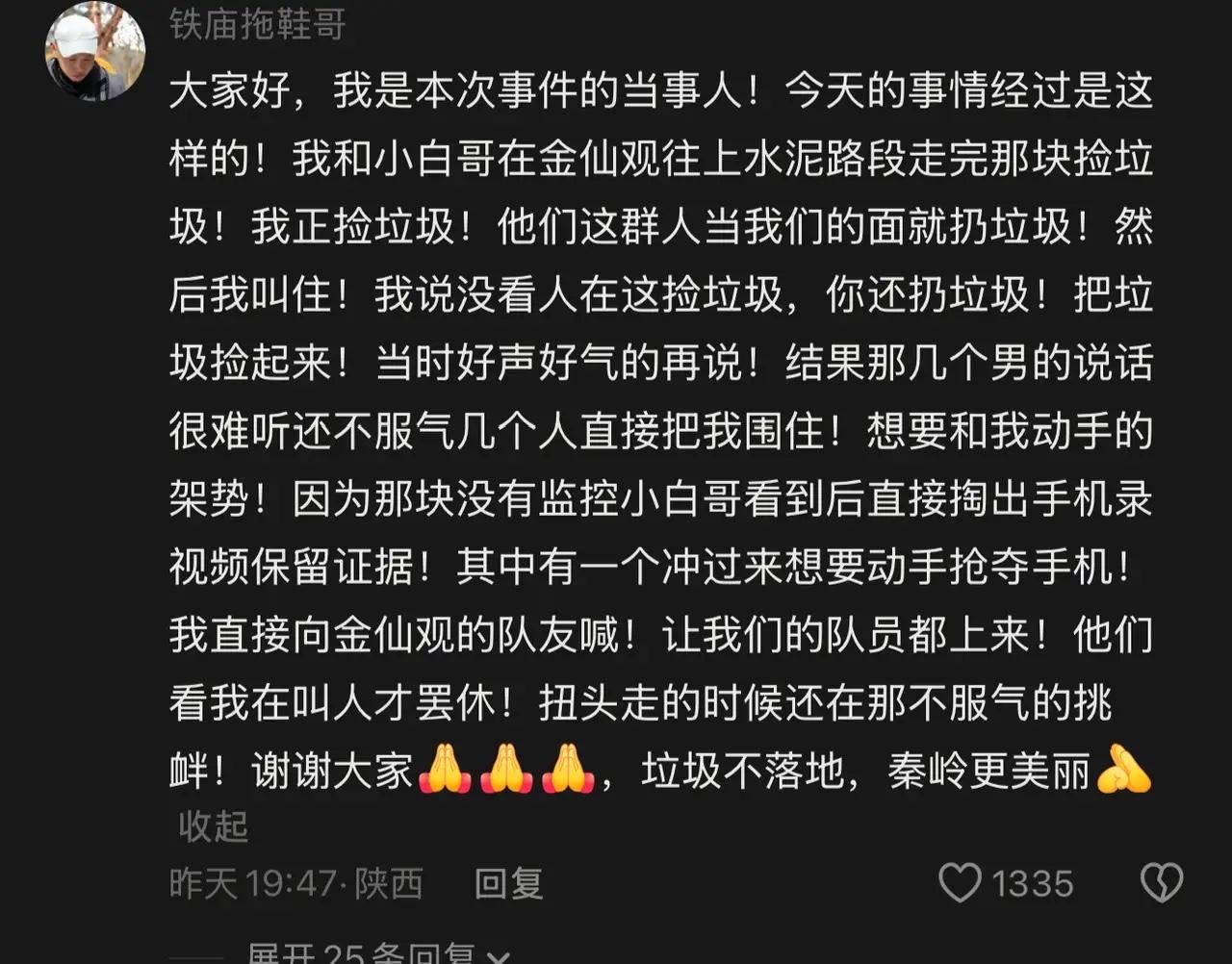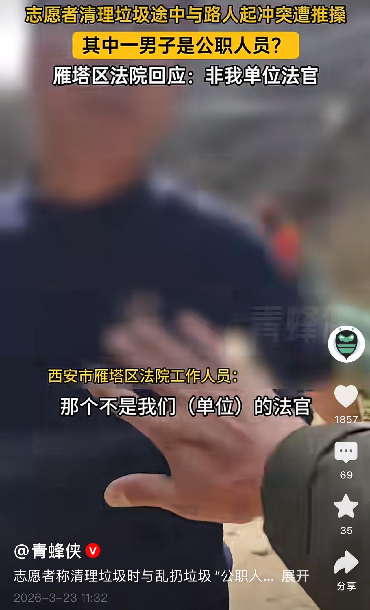 雁塔法院最新回应秦岭子午峪乱扔垃圾事情,这已经引起央媒青蜂侠的关注! 3月21日,在秦岭子午峪,一群游客当着当着捡拾垃圾志愿者面丢弃垃圾,引发双方冲突,后来这些人被志愿者曝光到网上,引发一片声讨,其中一名戴眼镜男子非常嚣张,引起公愤,有网友说,这个人是某政法系统人员! 雁塔法院回应:不是自己法院的人!从口音看,是西安当地人,目前发视频的人已经删除视频,但事情还在发酵!这个素质差的人估计瑟瑟发抖了吧,现在大家都在找他!