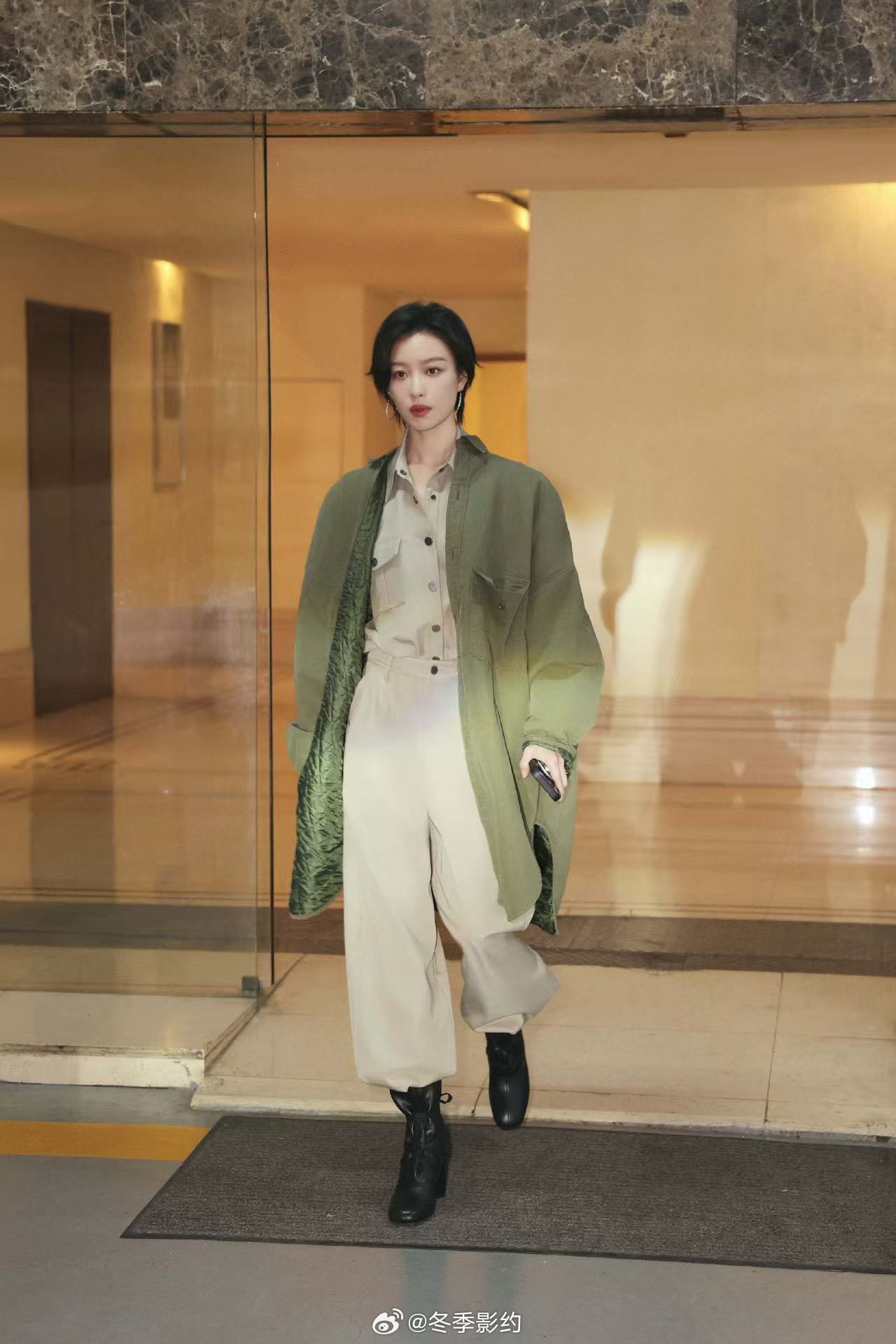 倪妮穿得好A笑得好甜 倪妮扫楼现场状态超绝!卡其色连体裤把干练和优雅穿到了极致,